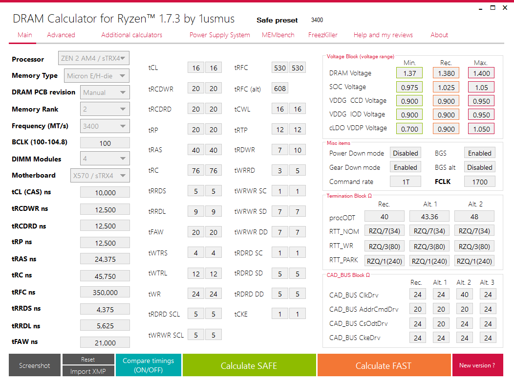 Первички 16-20-20-20-40 60 RFC Авто tRDWR 9 vDIMM около 1.38V vSOC 1.05-1.1V (начинать с меньшего) ProcODT 34-40 DrvStr Авто или 20-20-20-20, или 24-20-24-24