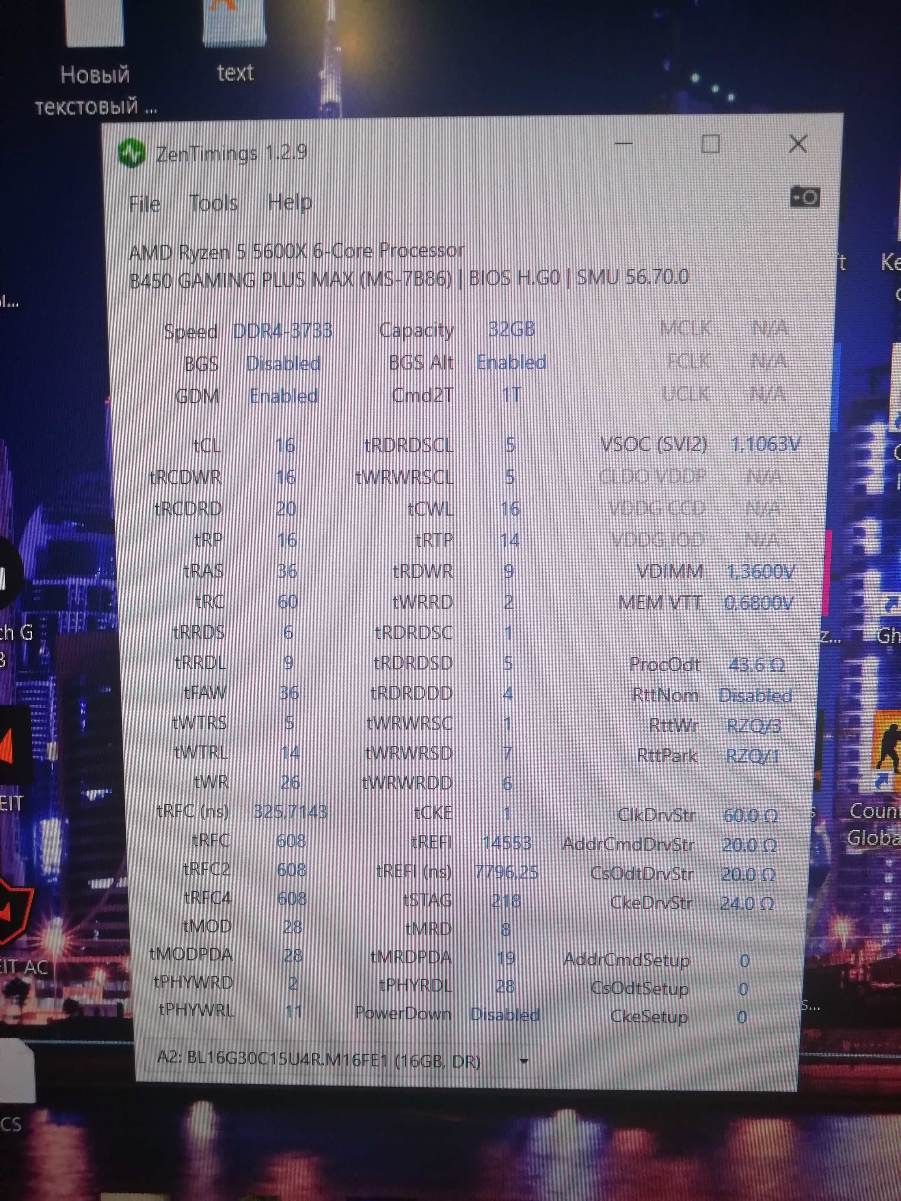 Всем привет. Помогите с советом: msi b450 gaming plus max 5600x 32gb ballistix u4 dr двумя плашками по 16gb. Не могу настроить. Soc 1.1 vddp 0.95 vddg 1.05 любое изменение таймингов ошибки