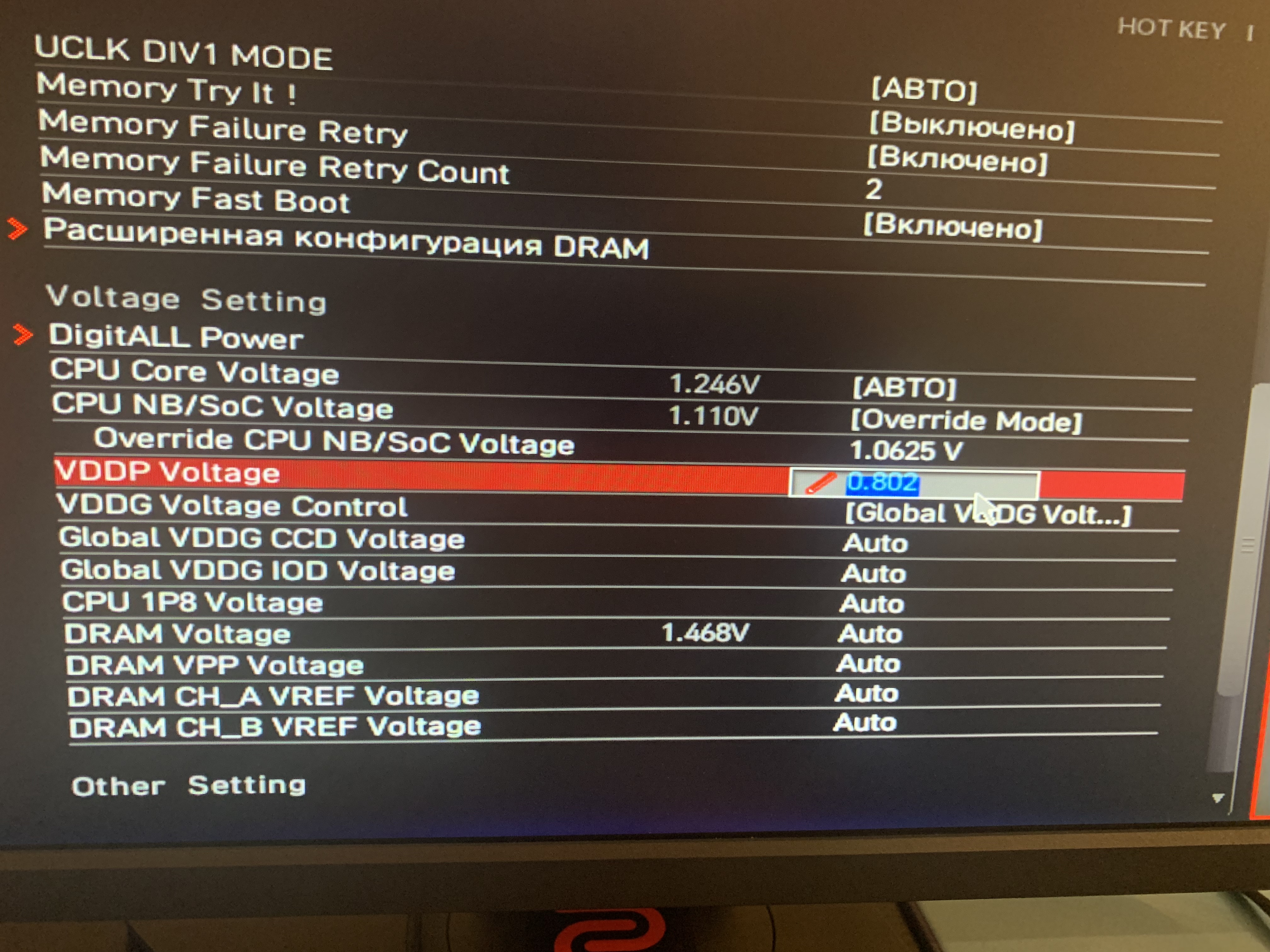 16-20-20-20-40 60 (выше уже по-моему некуда для этих чипов в таком конфиге). Определяемся с vDIMM и, возможно, vSOC и проходим тесты. Учитываем, что перевольтаж также во многих случаях приводит к нестабильности. CLDO можно сразу ставить 0.85V. Впрочем, vSOC скорее всего тоже - 1.025 или 1.05V подойдет. Остальные напряжения - Авто. Проц тоже сбросить в Авто.