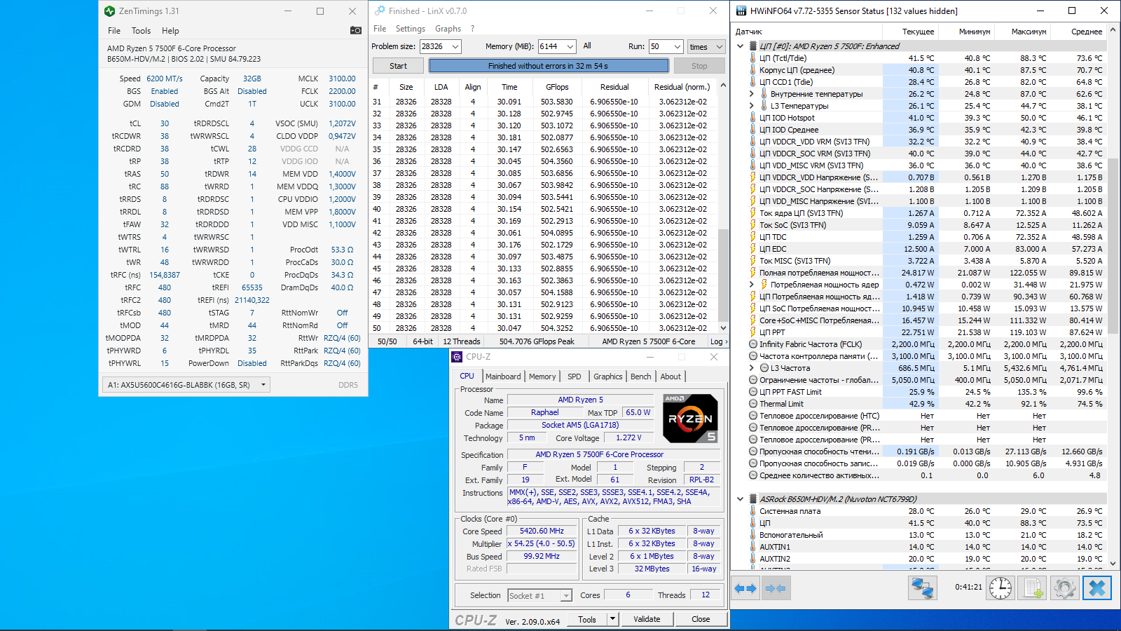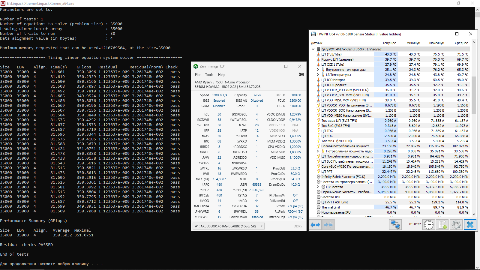 перезагрузился вместо разницы в 22 стало уже не 31 а 32 на 4800 так же скачет, делал 30 проходов, на 5600 xmp тоже самое, тестил уже не на 5425 а на 5200 так же фикс, еще попробовал фабрику в 2000 скинуть, потом выставил 2066 и 2200, те же самые результаты просто к примеру прикреплю результаты линпака экстрим и линкса на тех же настройках памяти, отличается только частота процессора, тут же можно проследить значения в gflops, пережатая память была бы нестабильна и значения были бы не +-4-5 а уже больше + память так же проходит тестмем