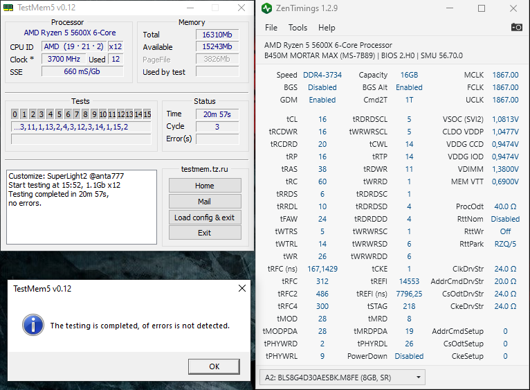 Спокойно завелась, даже tm5 c профилем superlight2 прошел.Но, когда пытаюсь перенести с калькулятора 2-е тайминги, сразу БСОД. Заметил еще одну странность моих планок (ballistix AES@XMP 3000@ cl15 16 16 35, 2x8gb) что не берут 1.45v. Просто черный экран. Так же FCLK 1900,тоже черный экран. Приходится сбрасывать биос для вкл. Что делать? Оставаться на 3600 или 3733?