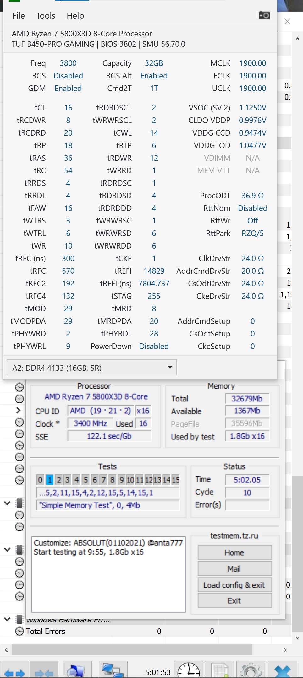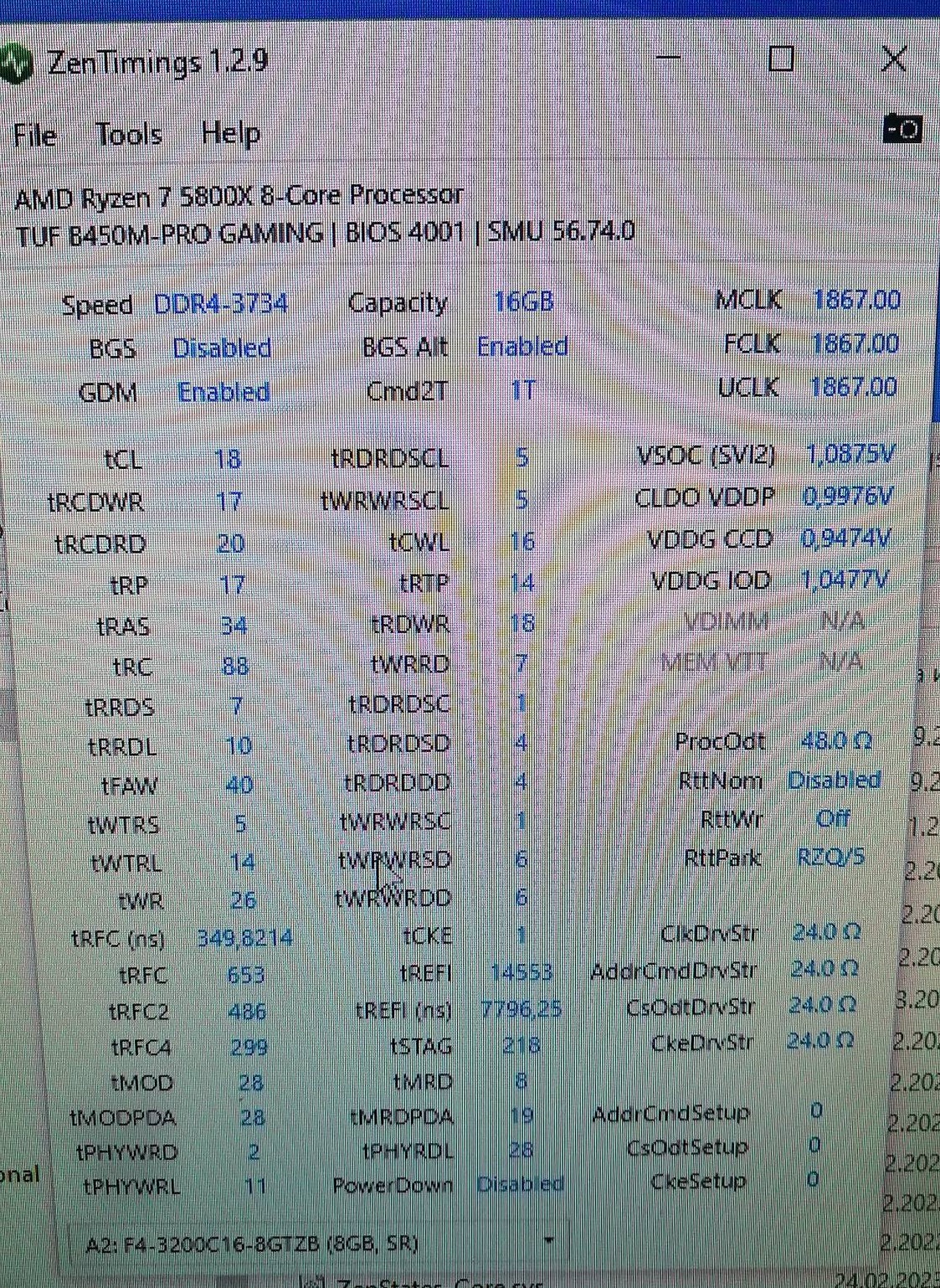 Добрый вечер, нужна помощь Имеем: Ryzen 5800x Asus Tuf gaming pro b450 2*8 GSkill F4-3200c-16D-16GTZB c профилем 16-18-18-38 на 1.35в маркировка 8810С - Samsung C-die (thaiphoon подтверждает это но пишет B\C die)