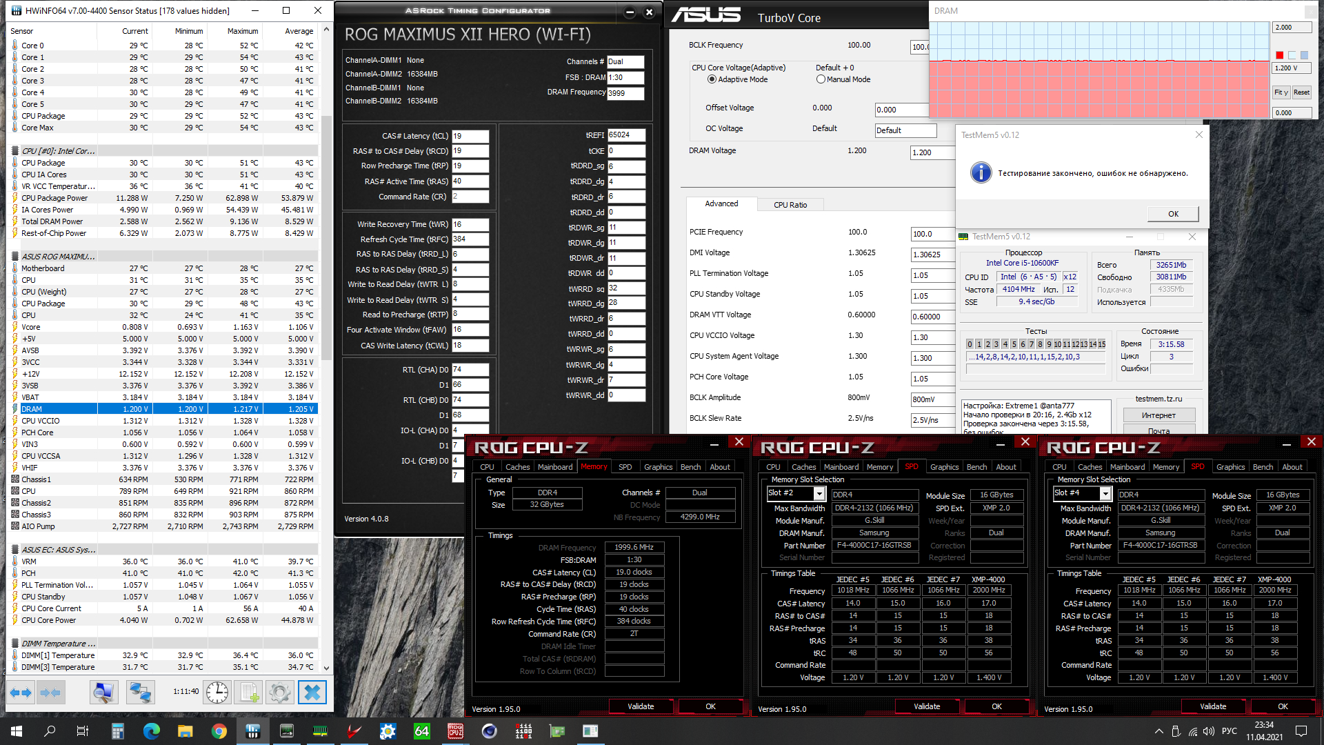 Продолжаю доканывать комплект 3000С14. При фурмарке одинаково не проходит тесты. Что на профиле 3000-14-14, что 4000-18-19, что 4300-19-21. Причем в начале первого теста. Выдает ошибки и все. И это с обдувом 120-кой. Т около 47 в тестах. Так что я пока брошу эту затею. ВК греется до 75, в корпусе ад, не буду мучить память. Пройдет без фурмарка экстрим - на этом и успокоюсь.