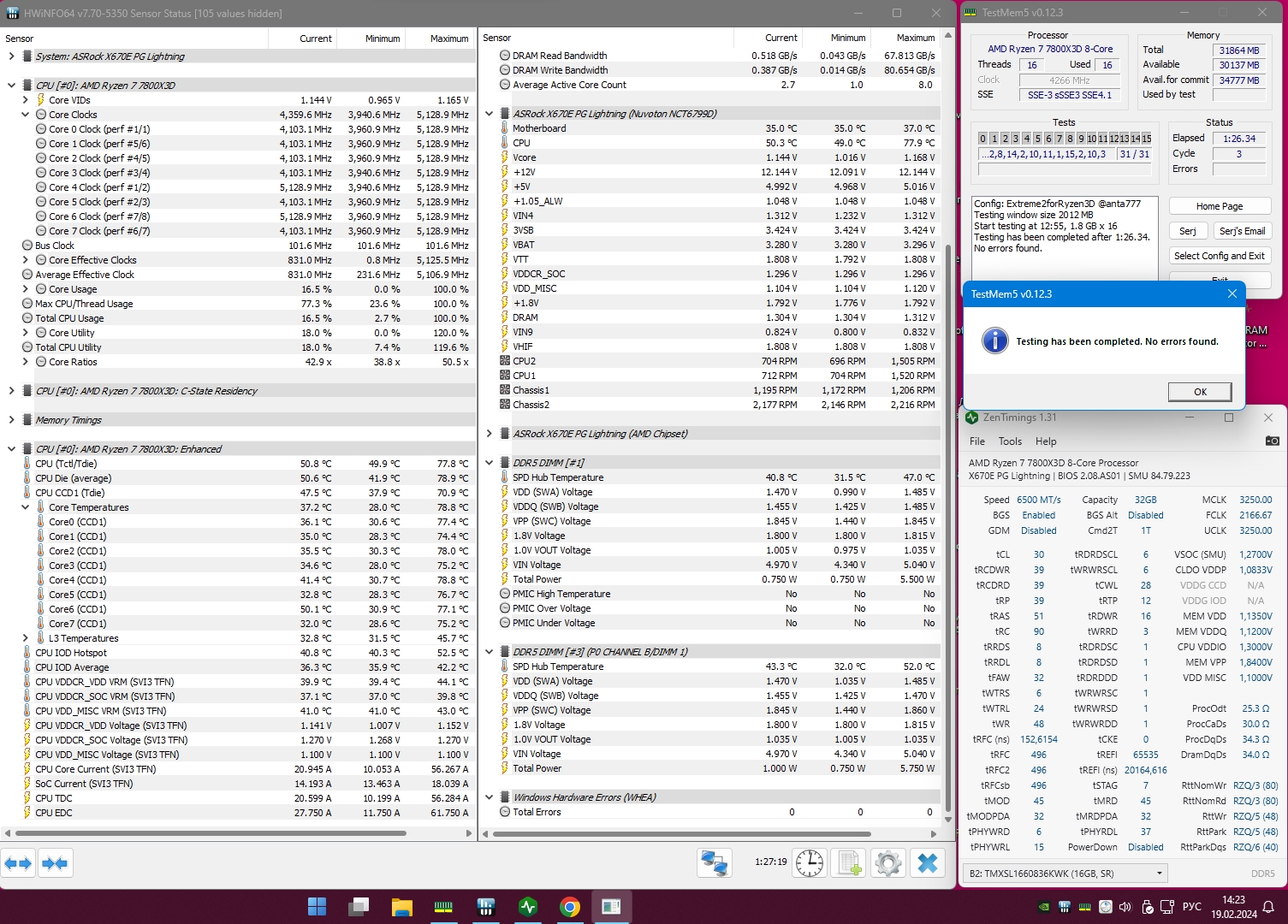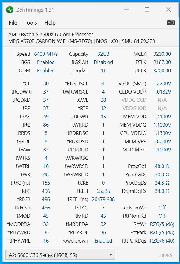 в принципе 2х16GB M-die 6000 c xmp36-38-38@1.25v могут 6500 c 30-39-39&tRFC=496(480 не тянет), но лучше 512(чтоб кратно tFAW)@1.47v
