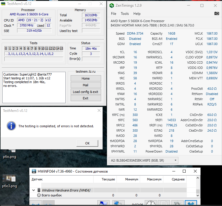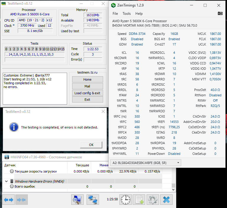 Ballistix (AES-M8FE). Попытался взять 3733. Пока настроил 1-е и 2-е тайминги. WHEA нет ошибок. Из 3-х прописал оба SCL-4 (на 3 не едут, сразу БСОД). TCWL-avto. Можно улучшить?