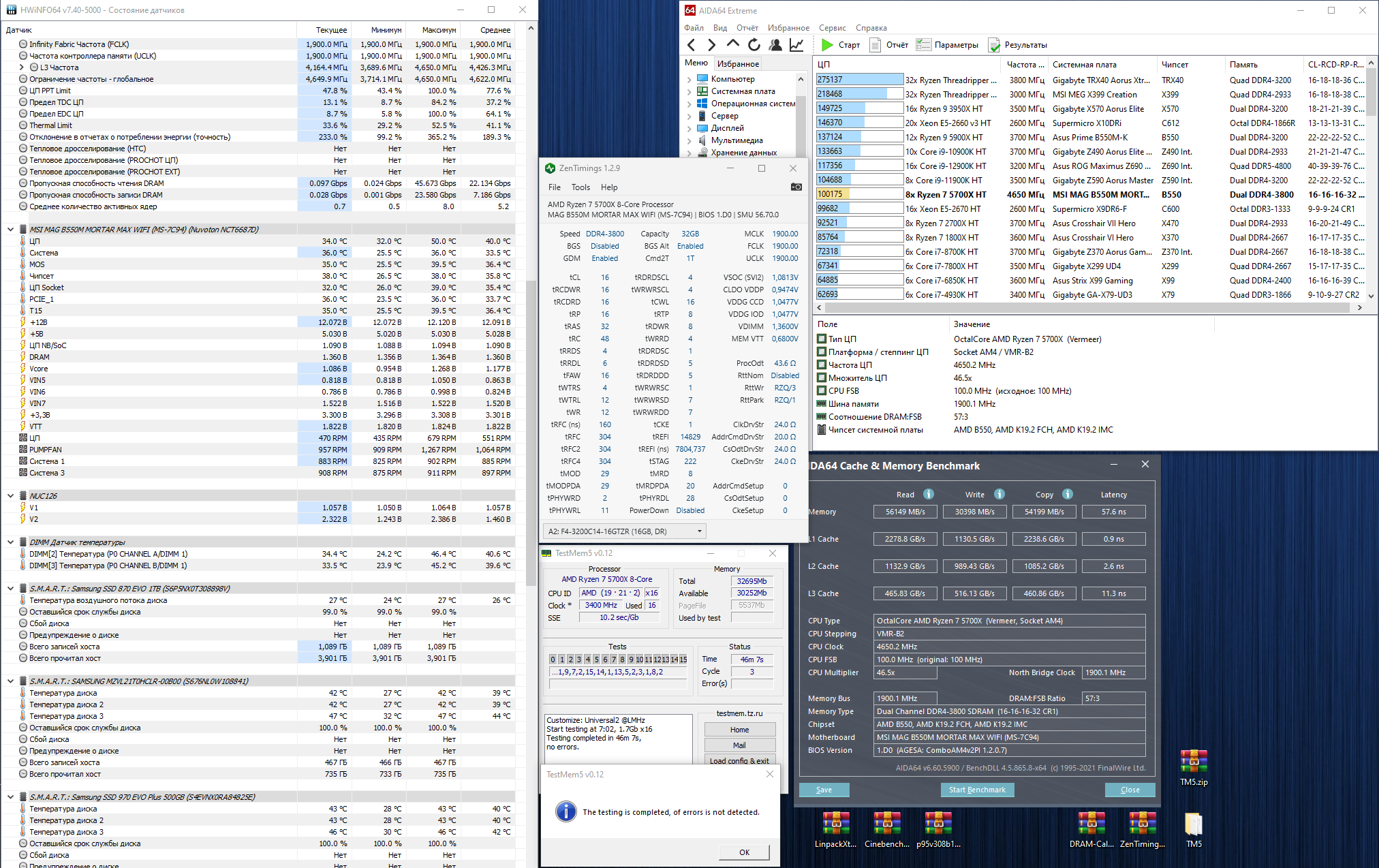 Всем привет! Удалось стабилизировать память. G.Skill TRIDENT Z RGB [F4-3200C14D-32GTZR] 32 ГБ Подскажите, куда двигаться дальше. Поднимать частоту или ужимать тайминги? Вроде как на частоте 4000 запускал (1.4-1.5) но сыпались ошибки, без настроенных таймингов. Бсодов нет. Мать MAG B550M MORTAR MAX WIFI. На температуру памяти не смотрите. Кульки корпуса 800, не поднимал. Обдува, можно сказать как такового нет. Выше 47,8 градусов по датчикам не поднималась при ТМ5 экстрим, 1,5 часа. Запас по напряжению вроде есть. В общем буду рад любым советам или критике.