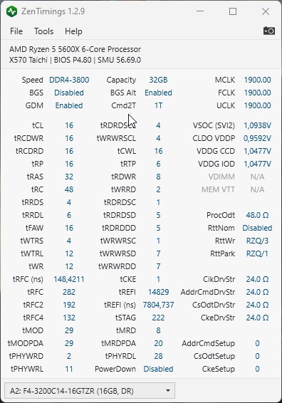 В общем получилось как то так. tCL - ниже не жмётся. В биосе стоит 15 но доска выставляет сама 16. C выключенным GDM, система не стартует. Сейчас пытаюсь стабилизировать вольтаж памяти на 1.41-1.42, на 1.4 не заводится. Тесты память проходит с бубликом. Ошибок нет но, память греется до 56 градусов. Приколхозил вентилятор для обдува памяти на время. Можно что то улучшить, или оптимизировать, или нет больше смысла жать дальше? Так и не понял как редактировать tPHYRDL. В биосе нет возможности его редактировать. Серым выставлено. В общем буду рад советам.