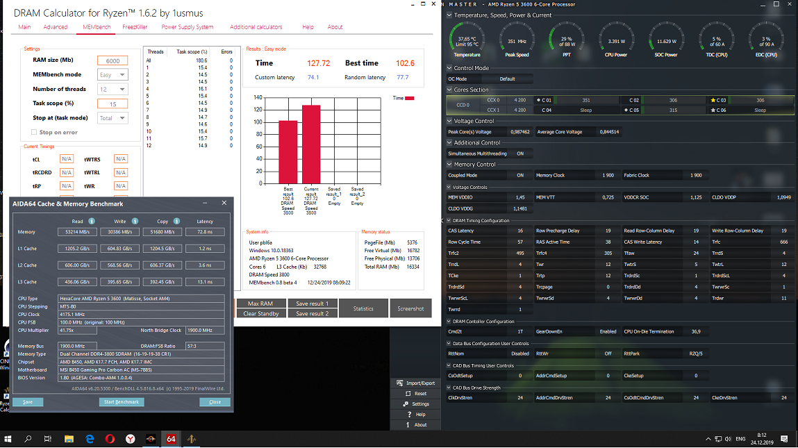 Всем привет. Вот и стал я "счастливым" обладателем Рязани. Теперь приходится писать сюда. Не судите строго, если что не так. Как никак первое сообщение. Проблема следующая: не могу разобрать память (g.skill f4-4000 gvk 18-22-22-42). Как я понял это djr. Тайфун у меня не запускается.(один раз умудрился его включить и все) Пробовал разные ппресеты с форумов. Один даже кажется от Юрия (где у него на cjr было 3800с16 с чтением ~58, задержкой ~61 на райзен 2700х кажется) Поставил все кроме trp 10 (у меня было 12) и в результате тест в калькуляторе порядка 140сек, чтение 53-54, задержка 67+. Сейчас выставил как у какого то дикого азиата из ютюба (на сколько смог. Уж больно у него напруга лютая). Но результат стал только хуже. Скрин прилагаю.