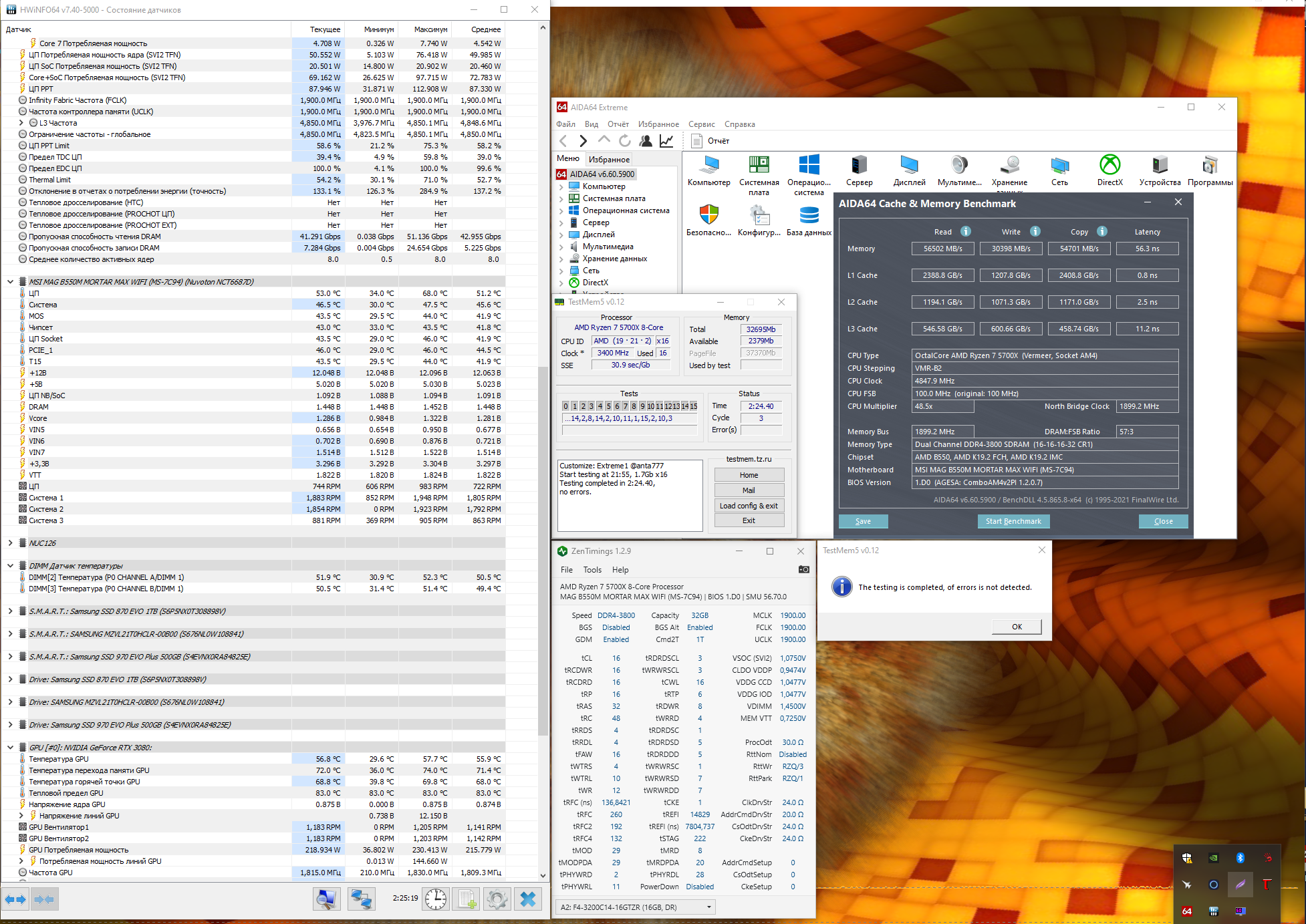 Корпус XPG DEFENDER BLACK (DEFENDER-BKCWW). Вроде как не самое дно выбирал. Продуваемость нормальная. Выкинул родные вертушки и поставил 4 вентилятора 120MM B2DN-18NPW-R1 COOLER MASTER. 3 на вдув, 1 на выдув. 2 вентилятора ARCTIC P14 SILENT (black/black) ACFAN00139A, на выдув вверх. На камне стоит Noctua NH-D14 SE2011, 2 вертушки. Первую максимально поднял, для доступа воздуха к оперативке. Видеокарту задушил до 875 мв, ест не более 250-280 ват. Так что и греется меньше. Работу вентиляторов выставил на макс при с мелким шагом, так что при начале тестов крутятся на 1800. Подкидываю ещё Corsair Air Series AF140 LED (2018) Red 140mm (CO-9050086-WW), с прямым обдувом на на память. Тайминги разожму. Попробую ещё поиграться с VSOC, VDDG CCD, VDDG IOD, CLDO VDDP. Может получится найти стабильность. Как писал usr721, попробую стабилизировать каналы tPHYRDL