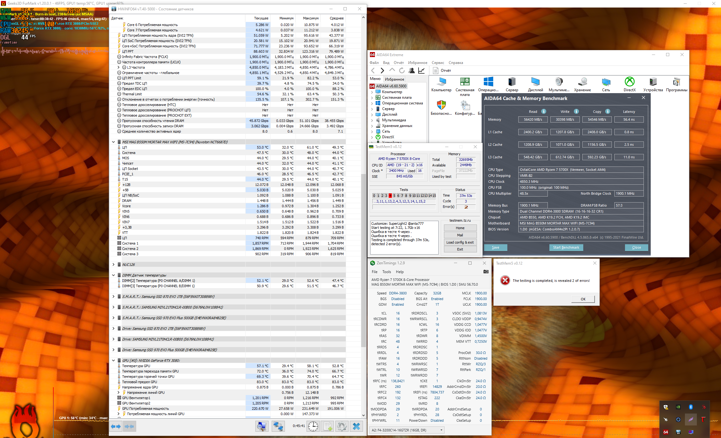 И да, тест ТМ5 экстрим 3 часовой с бубликом на 3800/CL15 у меня был пройден без ошибок. Скрина нет, не сохранил. Скидывал только часовой. Было стабильно без ошибок и температура 48.