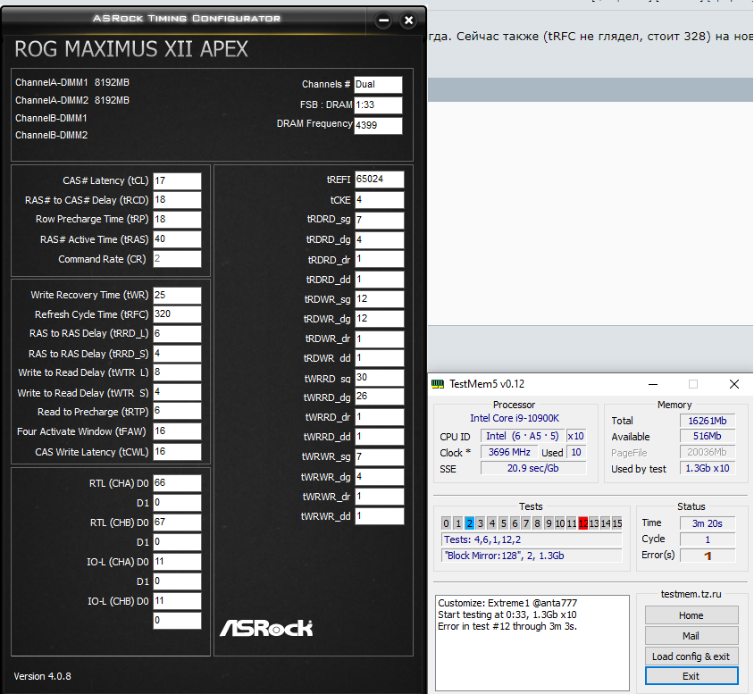 Единственное у меня вопрос: 1) ставил trefi на максимум - была 1 ошибка и 4 предупреждения "ram may be vulnerable..." 2) поставил trefi на 56550 (умножил 1450мгц на 7,8 и умножил на 5) - было 0 ошибок и 4 предупреждение "ram may be vulnerable...." 3)поставил trefi как вы сказали 43349(вроде это макс безопасное значение) - в итоге 0 ошибок и только ОДНО предупреждение "ram may be vulnerable...." вот тест еше идёт