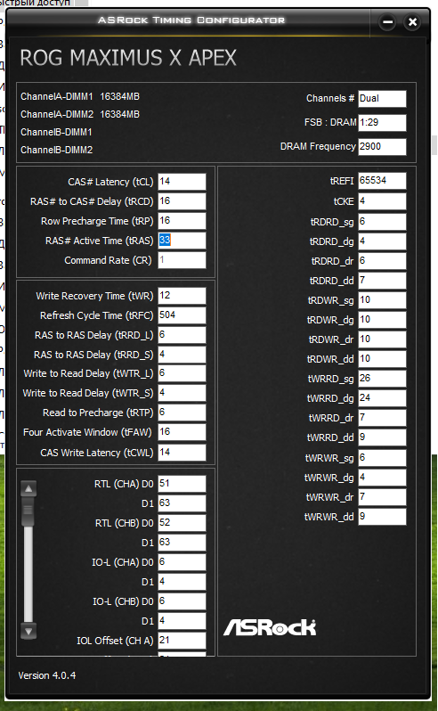 Начните с RCD, CL. Не обязательно должны быть одинаковыми, обычно CL идёт меньше чем RCD. RAS сразу пробуйте как RCD+CL+4, до этого значения от него существенная разница, дальше меньше. CWL<=CL. Допустимые значения 9,10,11,12,14,16,18,20. RP можете выставить по RCD, если пойдёт меньше - тоже неплохо, не уверен правда насчёт смысла. RTP без формул. Если не идёт вниз можно попробовать поднять чуть чуть RP. В DDR4 явно связан с WR соотношением 2 к 1 (например WR20\RTP10), физически хранится одно значения и в зависимости от операции интерпретируется. Скрутите FAW до 16(так и оставьте если работает). С таким FAW скручивайте RRD(оба, L обычно больше чем S), возможно поедут на 4 оба. Если до 4 не удалось спустить поднимите FAW до уровня RRDL*4 и попробуйте ещё, хотя это скорее всего уже почти предел. Обычно L>=S. L - SG(Same Group). S - DG(Different Group) Напр. RRD_L>=RRD_S. CKE=5 СCDL>=4 RDRD_DD и прочие подобные можно проигнорировать если у вас нет двух планок на один канал (4 планки). DD-Different Dimm. Тоже самое с DR-Different Rank если у вас одноранговая память. RDWR_SG(DG) и подобные сочетания скручивайте до минимальных рабочих, потом накиньте сверху +2. Как уже отметил обычно SG>=DG. WTR не трогайте он сам спустится когда будете скидывать WRRD_SG(DG) и прочие подобные. Если сам меньше не стал тогда руками скидывать. WR снижать через WRPRE если есть. Если нет или не снижает WR, То скрутите его скажем до 12 или +4 от рабочего, потом дожмёте если не лень будет. RFC явных формул нет, крутить после всего списка сверху. Не пытайтесь найти его минимальное значение если не хотите чтобы память начинала сыпать ошибками от любого чиха. найдите пограничное со стабильностью значение и накиньте сверху 20 или сразу 40. Может реагировать на RAS+RP, RRD, FAW, причём в обе стороны (то есть может "сломаться" если задрать названные), а может и не реагировать... REFi больше лучше. Связан с RFC. REFI сколько память "работает" - RFC сколько "отдыхает". Оба тайминга лучше не пытаться найти предельное значение.Заметно реагируют на температуру. Многие тайминги отзываются и на температуру и на напряжение. Поскольку напряжение может как позволить снизить тайминг, так и увеличить температуру, то середину можно искать очень долго, поэтому лучше бы вовремя остановится. Тестируйте тщательно с перезагрузками, сном, холодным стартом. RTL и IOL вам кто-то другой пусть советует как настраивать, от них у меня голова болеть начинает...
