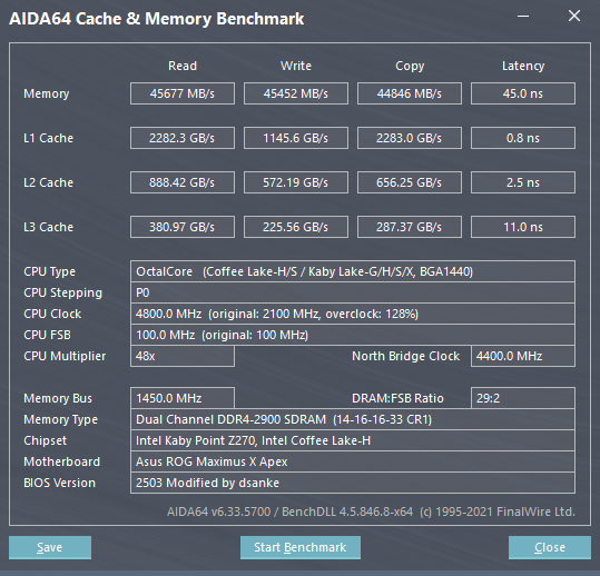 CPU Name: Intel® Core™ i7-7740K CPU @ 4.30GHz Motherboard Model: MSI X299 GAMING PRO CARBON AC (MS-7A95) Total Size: 8192 MB Type: Single Channel (64 bit) DDR4-SDRAM Frequency: 2750 MHz - Ratio 1:31 Timings: 21-31-31-63-2 (tCAS-tRC-tRP-tRAS-tCR) Slot #1 Module: G.Skill 8192 MB (DDR4-2137) - XMP 2.0 - P/N: F4-3200C14-8GVR