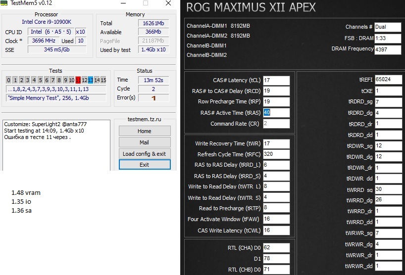 Верно, это скорее всего был twr, прошло (всего лишь) суперлайт2, благодарю! Вообще я так и делал сегодня в начале, все сбросил в дефолт, поставил частоту и первички, прогнал тест, потом поставил trp txp tcke trtp и опять прошел, потом tfaw и опять же прошел, а потом уже не помню что было, заблудился кажется вольтажах. ПРИМЕРНО знаю как что делать. cr 1 вообще не хочет никак ехать даже на смешных частотах.