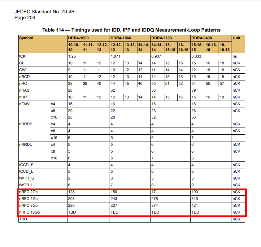 Добавлено спустя 38 минут 35 секунд: Всё же пробежал поиском "RFC" стандарт JEDEC DDR4 Нигде ничего не нашлось по кратности RFC чему бы то ни было или зависимости от чего бы то ни было (кроме REFI, они само собой тесно связаны друг с другом, но не следуют один из другого) Вот пример одной из табличек этого стандарта (Unit = nCK в последнем столбце говорит о единице измерения "такт" или "clock" на инглише)