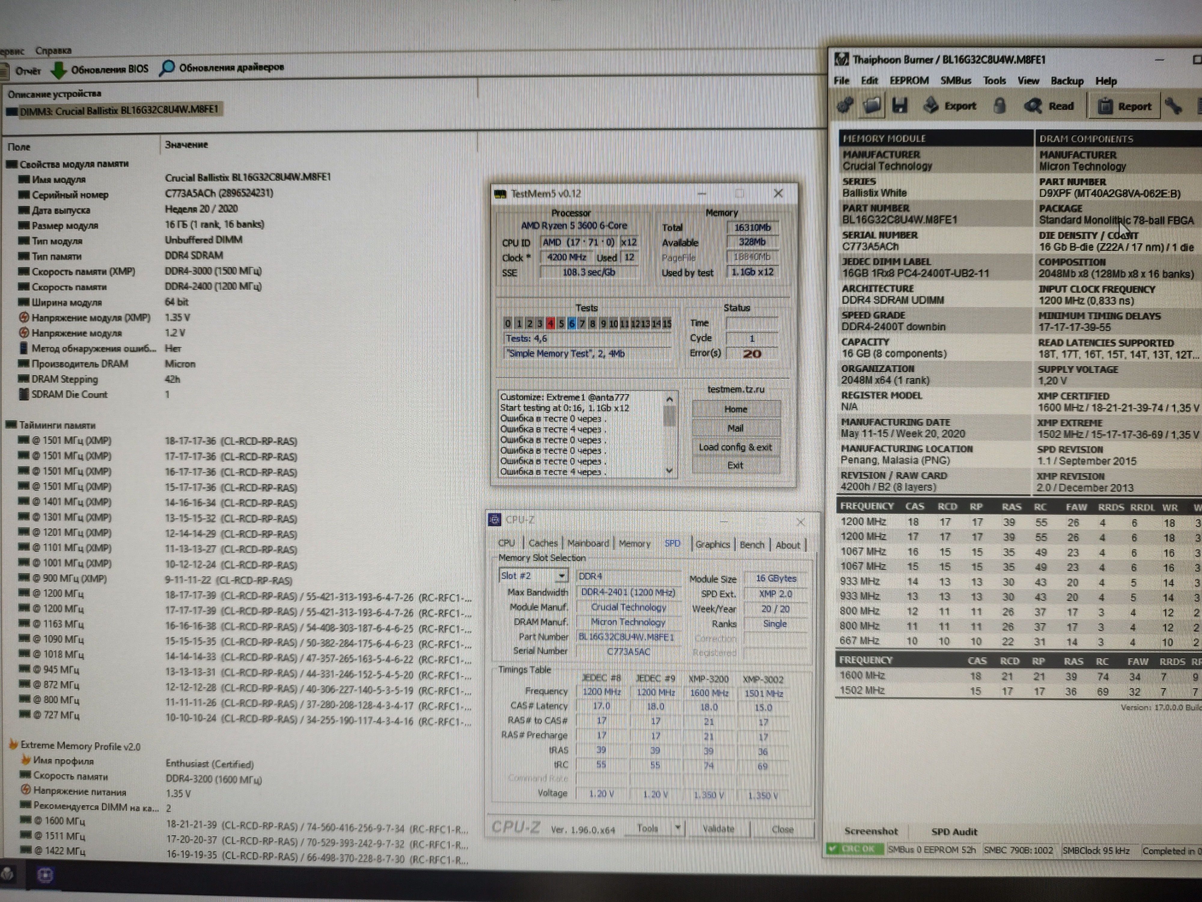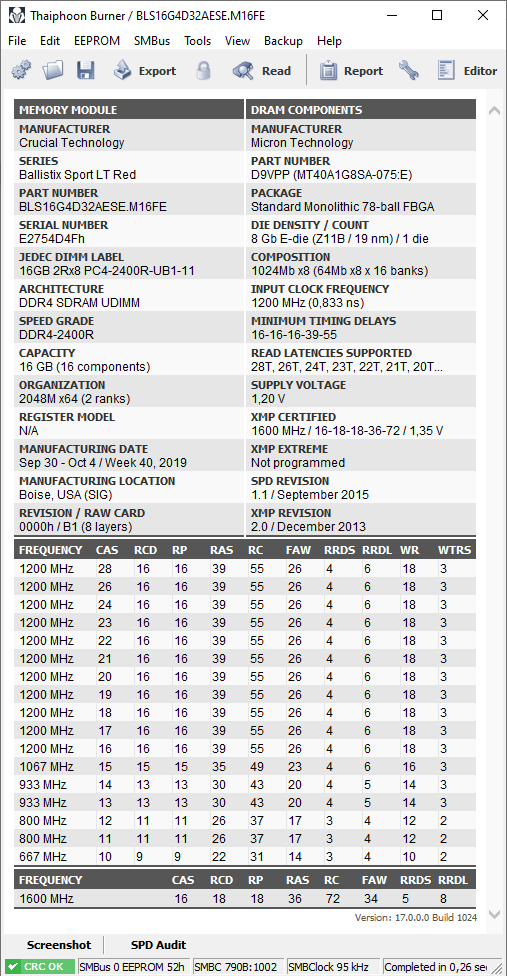 Посмотрел,но очень много не сходится,да и в статье бред какой то! Например про "Максимальный JEDEC профиль оригинальных плашек должен иметь частоту 2666 МГц" У меня 3 оригинальных малистика(правда старой ревизии AES) у всех тайфун показывает частоту 1200(или это актуально только для ревизии U4?). Наклейка на блистере нормальная-однотонная(но с пузырями),9-ка не пропущена,цифры под штрихкодом обычные. Сейчас в макро режиме фотал-штрихкод опознан,но находит по нему балистик 3000мГц сл15