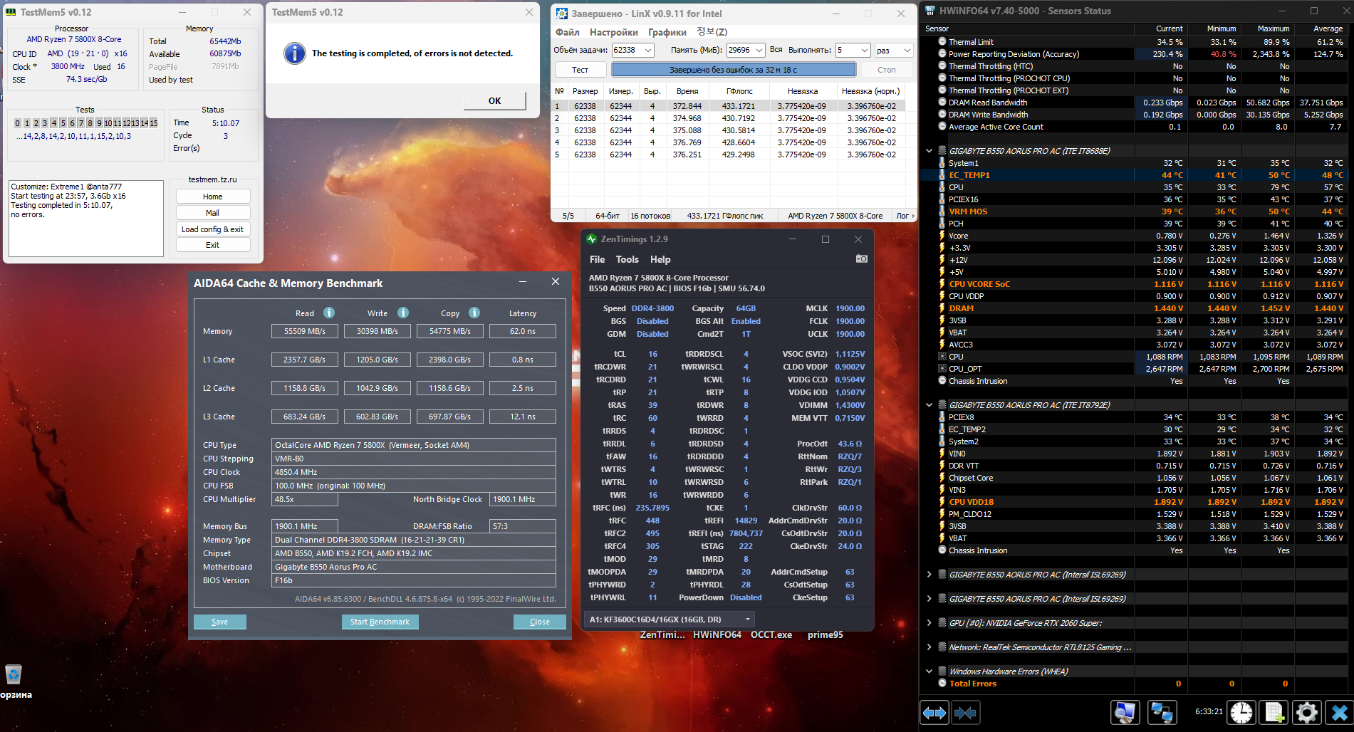Всем привет! Мне нужна помощь с разгоном. Может где-то ошибся или делаю что-то не так... Дело в том, что при таких таймингах начинает сыпать ошибками после 30 минут теста TM5 с конфигом Heavy5opt от anta777. Ошибка по тесту 6 появляется спустя 30 минут, затем по тесту 7 через минуту и следующая появляется через ~5 минут. Сори, что без скрина, забыл сделать, а в лог почему-то пишется только ошибка по 7 тесту. Модулей оперативной памяти - 2. Температура в норме, за всё время прогонов выше 45° не было.
