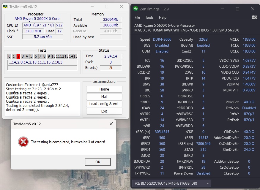 Сделал как вы написали сверху. Поменял напряжения и сопротивления как в гайде, так же поставил Auto на Command Rate и благодаря этому смог изменить режим GDM на Enable. Но у меня все равно выскочили 3 ошибки №2 на тестировании в ТМ5 на конфиге Extreme1. Они вышли в промежутке между серединой 2-го и середины 3-го цикла. Больше не появлялись. Помогите плз с настройкой, уже 3 дня потратил на тесты и настройку оперативки Скрины прилагаю.