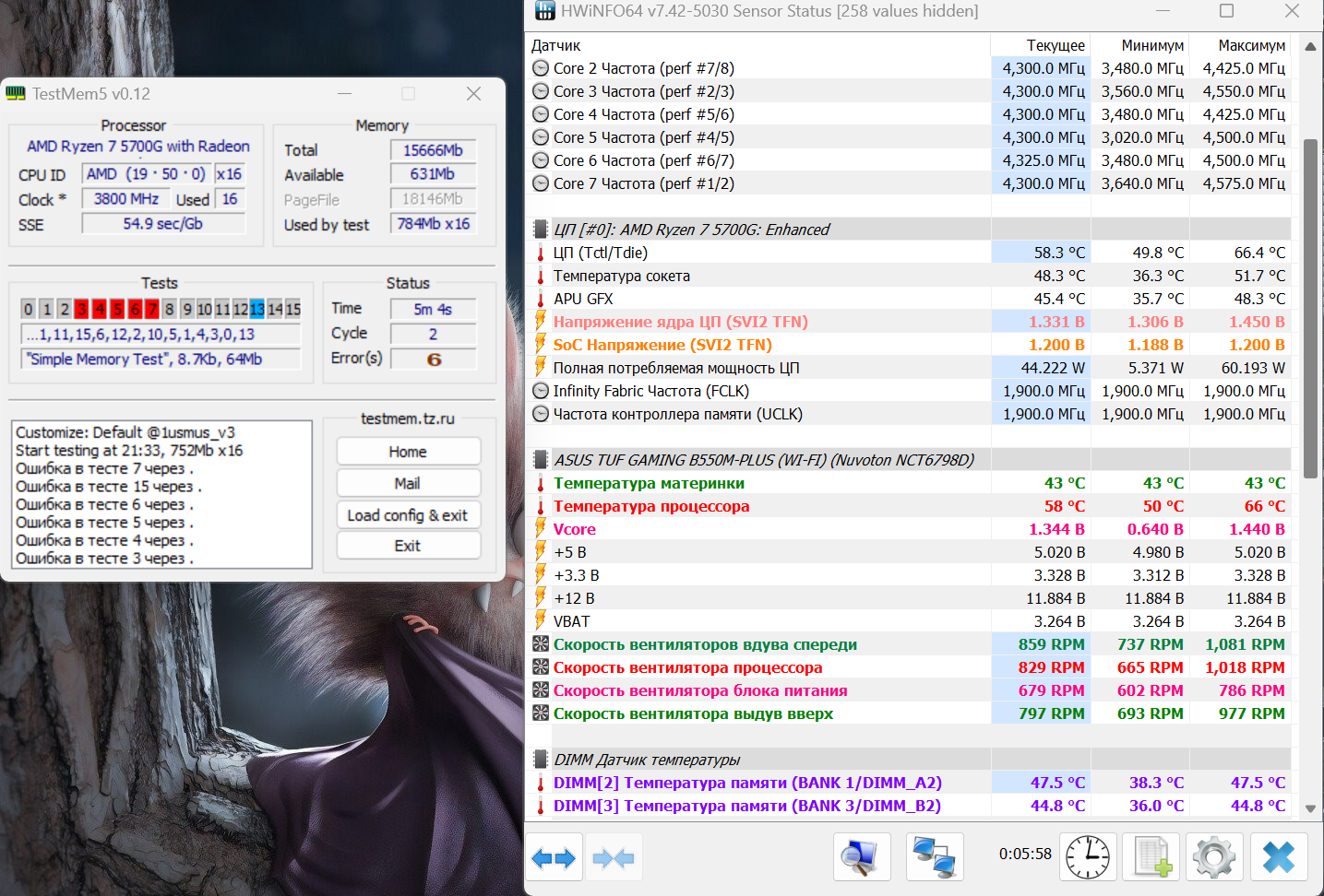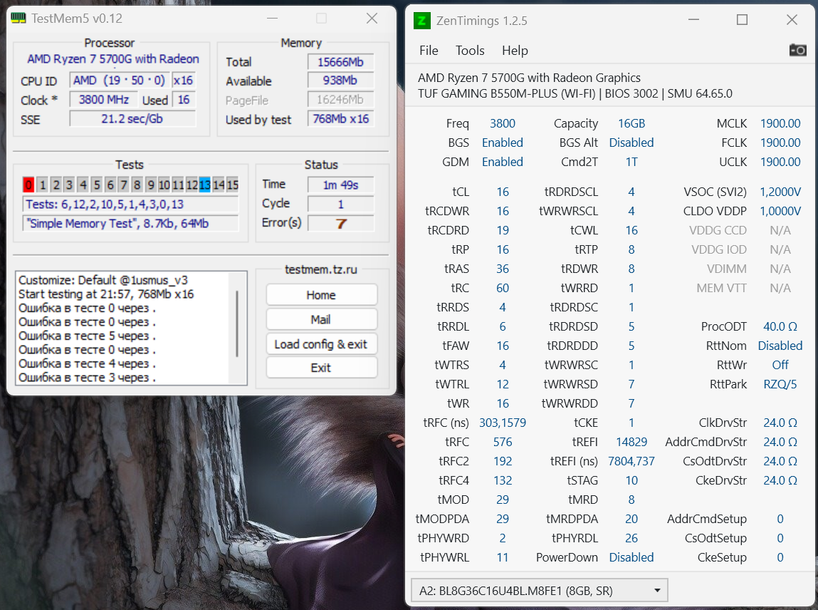 Всем привет !!! Помогите. Железо TUF GAMING B550M-PLUS (WI-FI); AMD Ryzen 7 5700G; 2хDIMM DDR4 Ballistix Black RGB BL2K8G36C16U4BL; SAMSUNG 970 EVO Plus MZ-V7S250BW 250Гб, M.2 2280; SAMSUNG 860 EVO MZ-76E250BW 250ГБ; SAMSUNG 860 EVO MZ-76E500BW 500ГБ; Звуковая карта PCI-E ASUS Strix Soar, 7.1; Блок питания SEASONIC Focus SGX-500 SSR-500SGX 500W 80+ Gold SFX; кулер Thermalright AXP-200 Muscle. Все работало идеально, процессор в дефолте с бустом до 4650, графическое ядро в manual 1900, SOC в авто (1,2), все LLC в авто, память по 1usmus калькулятору 3800 fast (даже на 3900 тоже работала с теми же параметрами), все проходило любые тесты ТМ5, корпус хорошо продуваемый, температуры все комфортные. Решил поэкспериментировать с PBO +200 + курва, все настроил с помощью corecycler-v0.9.3.0 (поядерно, от -10 до -18 по ядрам), вроде все хорошо, процессор бустит до 4850, производительность в CPU-Z и в СВ23 чуть больше стала. Ну а далее решил запустить тест ТМ5 1usmus. повалили ошибки через пару минут. Ну да и ладно значит не получилось с PBO и курвой только 1 день зря потерял, скинул биос перемычкой, настроил все как было раньше, как итог ошибки в ТМ5 на 3800, поставил 3600 тоже самое, от 5 до 15 ошибок, всегда разные и в разное время выскакивают. Потом опять сброс биоса, все в стоке и память в сток 2666 тоже через 15 минут пару ошибок вылезло, уже 2 день мучаюсь подбираю тайминги ошибки лезут через 1 - 8 минут опять разные но один раз прошел тест ТМ5 универсал потом все равно в нем опять 2-5 ошибок. Что я подпалил курвой????