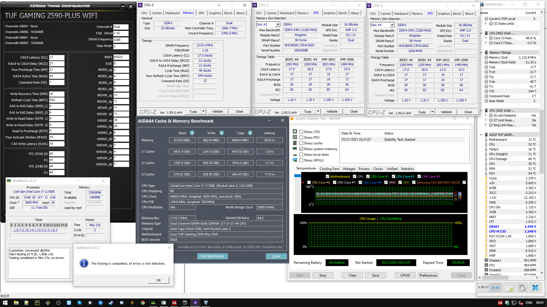 Разогнал память Kingston HyperX Predator [HX436C17PB3K2/32] 2x16ГБ до 4266 MHz на ASUS TUF Gaming z590 + i7-11700K в стоке с турбо-бустом. Память продается с XMP 3600MHz с таймингами 17-19-19-39 на 1.35V и работает на Gear 1 + CR2 (латенси минимально смог получить 45ns). Удалось сделать 4266MHz с таймингами 17-21-21-40 на 1.44V на Gear 2 + CR1 (латенси минимально смог получить 50ns). Единственное, заметил, что в HWiNFO мне показывает CR2, хотя в биосе стоит CR1, и в других программах показывает правильно CR1 - это странно. Пропускную способность увеличил с 52к до 67к на чтение - больше 20%. В соседней теме описывал все подробно и шаги настроек таймингов, и возникающие проблемы в ходе разгона - https://forums.overclockers.ru/viewtopic.php?f=4&t=629153