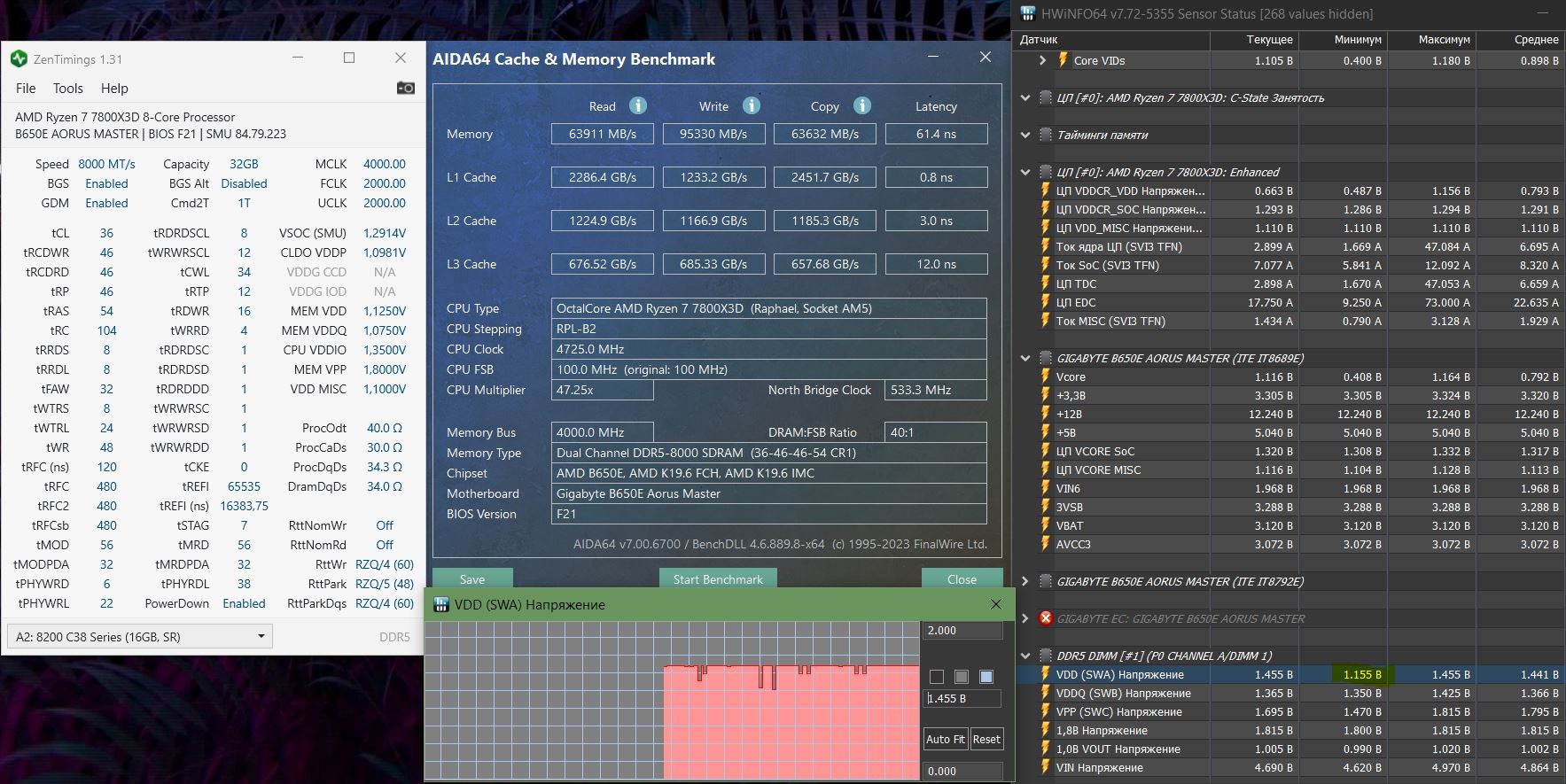 Выключил я эти оба пункта, по очереди. Отключение LL на xmp8000 действительно увеличило задержку в среднем на 1 нас по результатам 3х проходов. Затем отключение второй функции, вообще ни на что не повлияло. Все менее не понятно почему 8000 вне xmp профиля не стартует вообще... Но вот что интересно, решил я понаблюдать за вольтажами под тестами и обнаружил кое что интересно, а именно vdd ведет себя как будто он динамически регулируется. Первый раз я заметил что после прохождения аиды vdd падает до 1.250 на секунды 3, затем возвращается к 1.455..и затем в простое вообще иногда до 1.150 опускается. Я решил включить график и посмотреть прохождение аиды. Что имею - Первая просадка до 1.250 сразу после прохождения теста read, сразу после нее подьем через 1.35 к 1.45, затем после окончания теста памяти просадка до 1.150, затем при смене тестов уровней кеша еще одна 1.150 после окончания теста 1.455 с дальнейшими короткими просадками до 1.35. Такие дела... На скрине результаты с выключеными фенечками от xmp но в профиле xmp работает все!