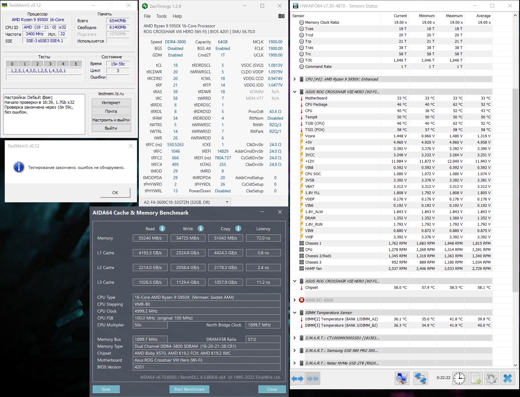 4. Перед настройкой частоты и таймингов рекомендуется установить принудительное охлаждения на модули памяти, особенно для памяти с чипами Samsung B-die, повышение температуры памяти выше 48°, может сопровождаться дополнительными ошибками, не связанными с неправильной настройкой таймингов, что затруднит их поиск и общую настройку памяти.