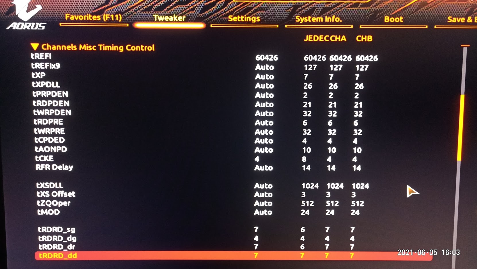 Разгон памяти у современной DDR4 (16 банков,RRDS=4,FAW=16,BL=8) эффективен только при tRC<=64,если каждый новый блок чтения происходит с разных банков памяти. Для 4-х слотовых плат при разгоне желательно в биосе отключить неиспользуемые слоты. Для максимальной производительности памяти значение tRFC в тактах для 8-Гбитных чипов должно быть кратно 8,а для 16-Гбитных чипов - 16. Если это правило не соблюдать, то будут вставлены лишние такты при каждом цикле обновления памяти. Для желающих максимально снизить tRFC. Делим tRFC на сумму tRCD,tRTP и tRP. Если результат ближе к 4, то снижать tRFC можно по 4 такта. Если результат ближе к 2, то снижать tRFC можно по 2 такта. Это связано с тем, что обновление происходит субмассивами, которые обязательно кратны 2.