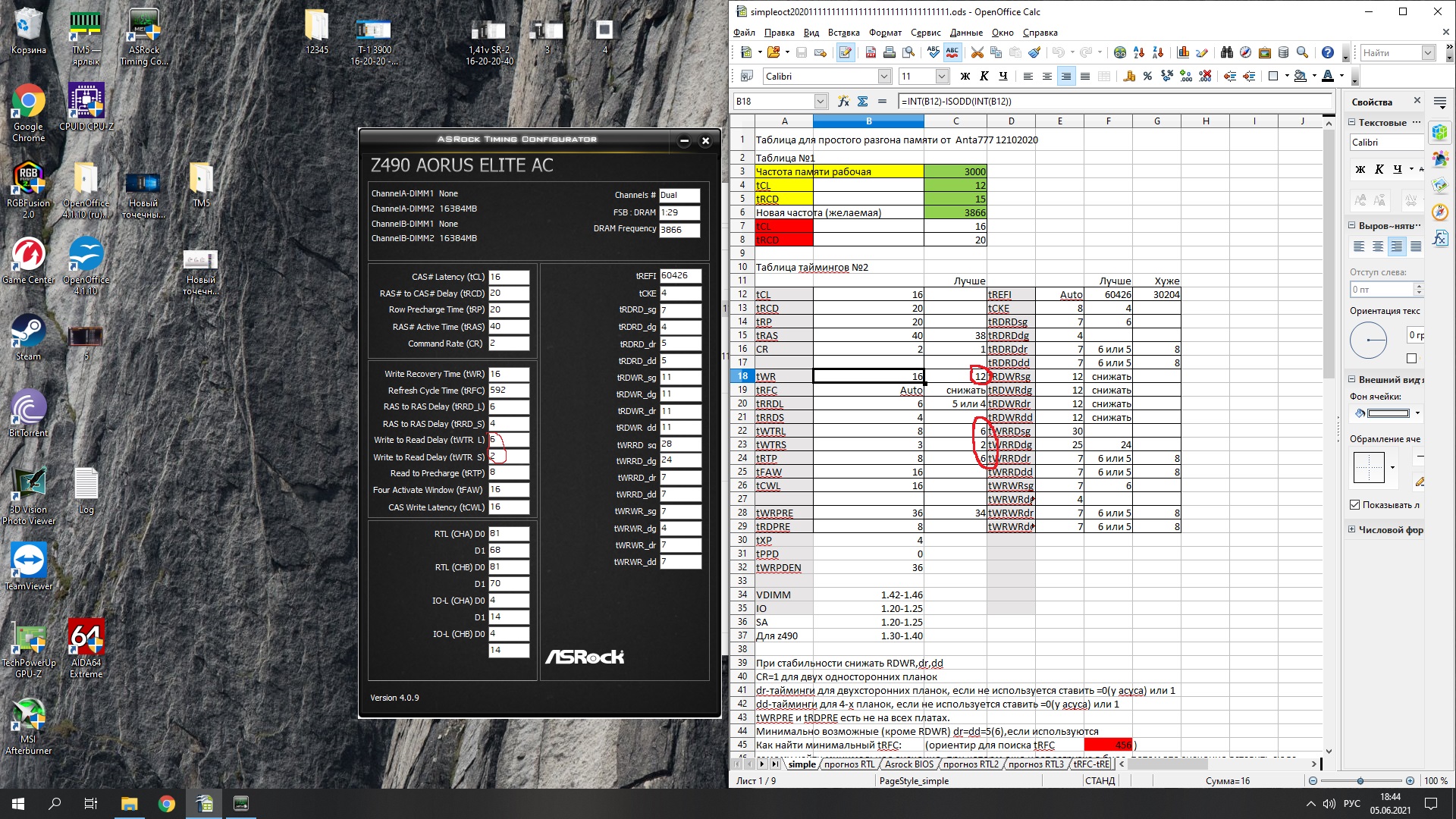 Начните с RCD, CL. Не обязательно должны быть одинаковыми, обычно CL идёт меньше чем RCD. RAS сразу пробуйте как RCD+CL+4, до этого значения от него существенная разница, дальше меньше. CWL<=CL. Допустимые значения 9,10,11,12,14,16,18,20. RP можете выставить по RCD, если пойдёт меньше - тоже неплохо, не уверен правда насчёт смысла. RTP без формул. Если не идёт вниз можно попробовать поднять чуть чуть RP. В DDR4 явно связан с WR соотношением 2 к 1 (например WR20\RTP10), физически хранится одно значения и в зависимости от операции интерпретируется. Скрутите FAW до 16(так и оставьте если работает). С таким FAW скручивайте RRD(оба, L обычно больше чем S), возможно поедут на 4 оба. Если до 4 не удалось спустить поднимите FAW до уровня RRDL*4 и попробуйте ещё, хотя это скорее всего уже почти предел. Обычно L>=S. L - SG(Same Group). S - DG(Different Group) Напр. RRD_L>=RRD_S. CKE=5 СCDL>=4 RDRD_DD и прочие подобные можно проигнорировать если у вас нет двух планок на один канал (4 планки). DD-Different Dimm. Тоже самое с DR-Different Rank если у вас одноранговая память. RDWR_SG(DG) и подобные сочетания скручивайте до минимальных рабочих, потом накиньте сверху +2. Как уже отметил обычно SG>=DG. WTR не трогайте он сам спустится когда будете скидывать WRRD_SG(DG) и прочие подобные. Если сам меньше не стал тогда руками скидывать. WR снижать через WRPRE если есть. Если нет или не снижает WR, То скрутите его скажем до 12 или +4 от рабочего, потом дожмёте если не лень будет. RFC явных формул нет, крутить после всего списка сверху. Не пытайтесь найти его минимальное значение если не хотите чтобы память начинала сыпать ошибками от любого чиха. найдите пограничное со стабильностью значение и накиньте сверху 20 или сразу 40. Может реагировать на RAS+RP, RRD, FAW, причём в обе стороны (то есть может "сломаться" если задрать названные), а может и не реагировать... REFi больше лучше. Связан с RFC. REFI сколько память "работает" - RFC сколько "отдыхает". Оба тайминга лучше не пытаться найти предельное значение.Заметно реагируют на температуру. Многие тайминги отзываются и на температуру и на напряжение. Поскольку напряжение может как позволить снизить тайминг, так и увеличить температуру, то середину можно искать очень долго, поэтому лучше бы вовремя остановится. Тестируйте тщательно с перезагрузками, сном, холодным стартом. RTL и IOL вам кто-то другой пусть советует как настраивать, от них у меня голова болеть начинает...