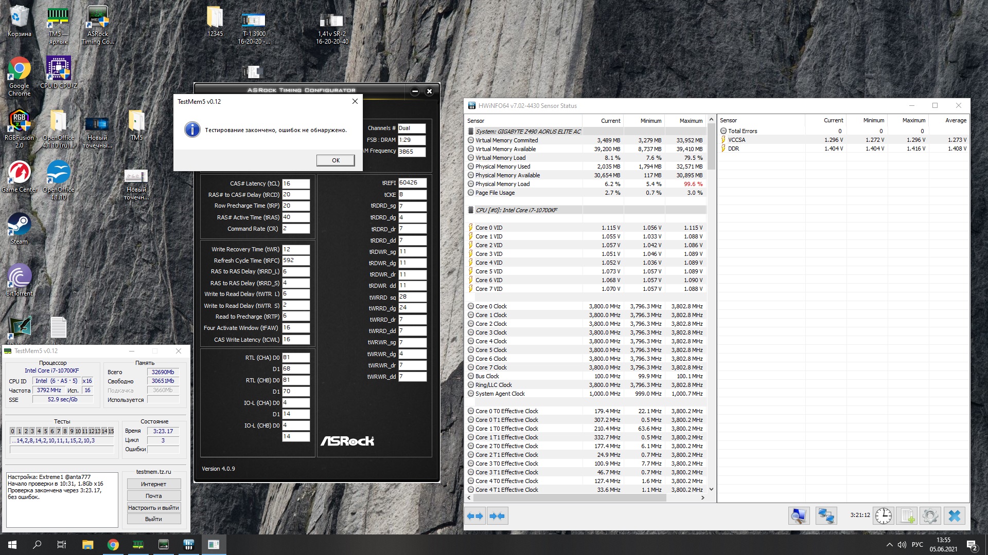 Обдуваю во время тестов 120-мм вертушкой, модули немного тёплые. Сейчас поднял IO и SA, вроде как, помогло. Уже 25 минут без ошибок.