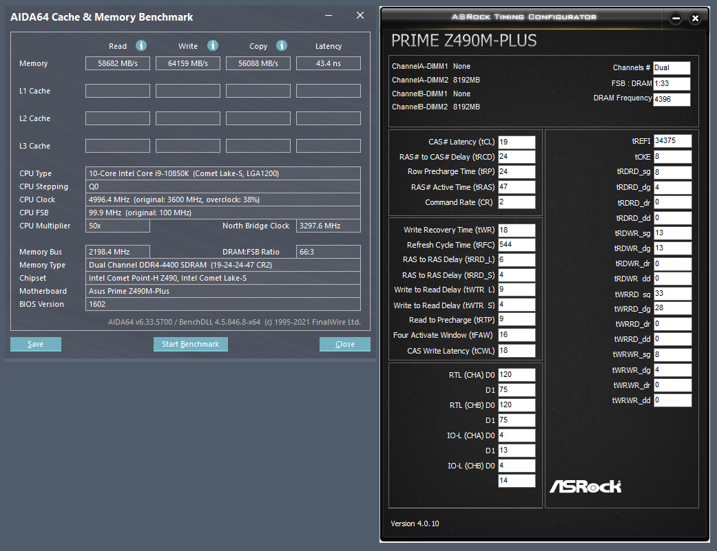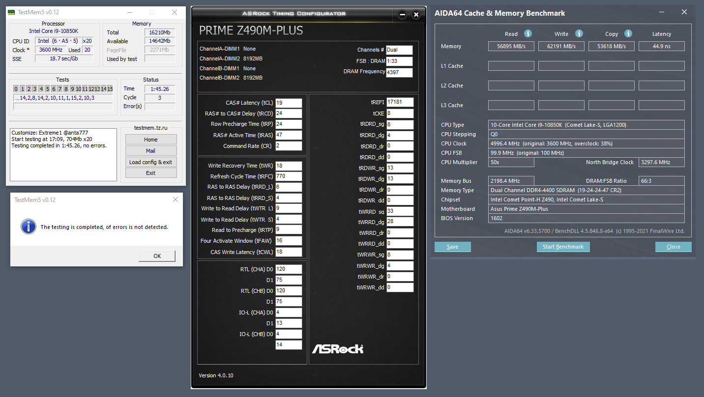 Вечер добрый! Сижу, кручу кит XPG Spectrix D50 из недавнего конкурса. Конечно, на моей простенькой ASUS PRIME Z490M-PLUS о высоких частотах мечтать не приходиться, но 4400 CL19 получилось стабилизировать на 1.5 В (1.30 IO и 1.35 SA).