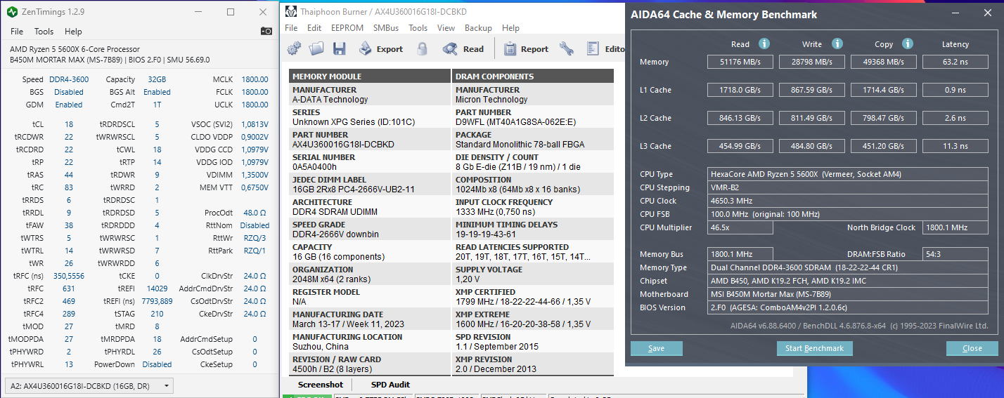 День добрый! Прикупил Xpg Spectrix D45G 32гб. В тайфуне показывает 2-ранк и micron e-die. По дате (март, 2023), кажись новая партия. Что можете сказать про эти чипы? Потанцевал интересует. Пока не гнал, времени нет, только xmp на 3600 врубил. Тест на кэш присутствует.