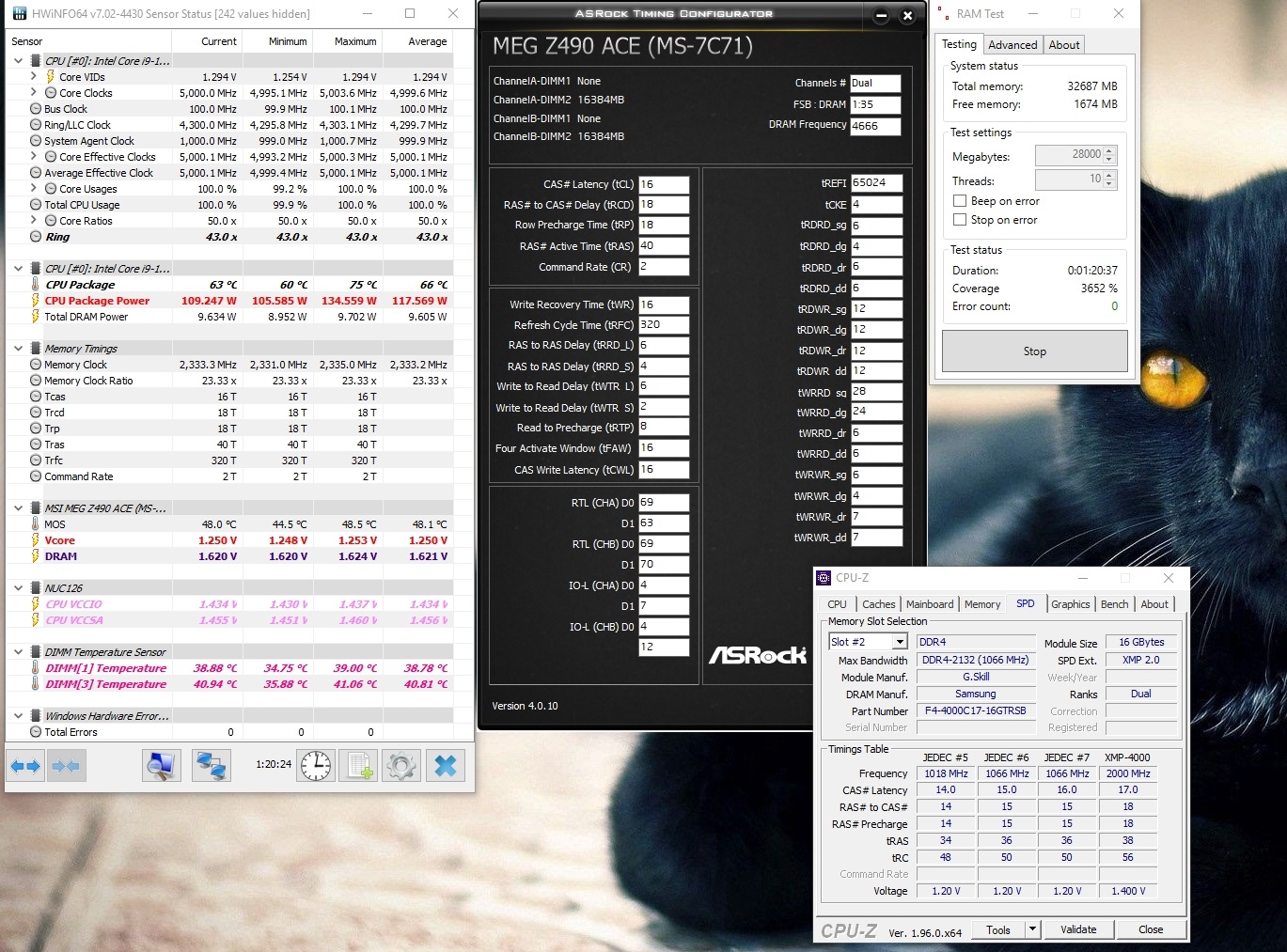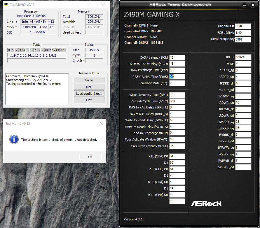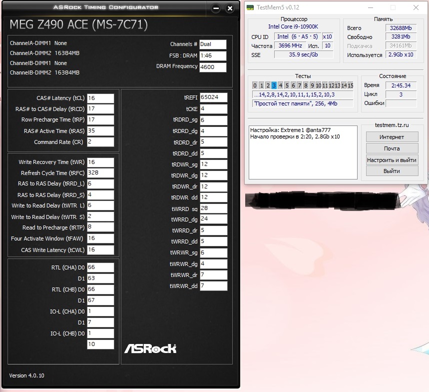Да, разумеется, извините, уже после нескольких дней разгона голова совсем не варит) Стабильность проверяю TestMem5, конфиг: Extreme1 @anta777 + включаю на фоне всегда стресс тест GPU в аиде64, чтобы темпу в корпусе повысить.