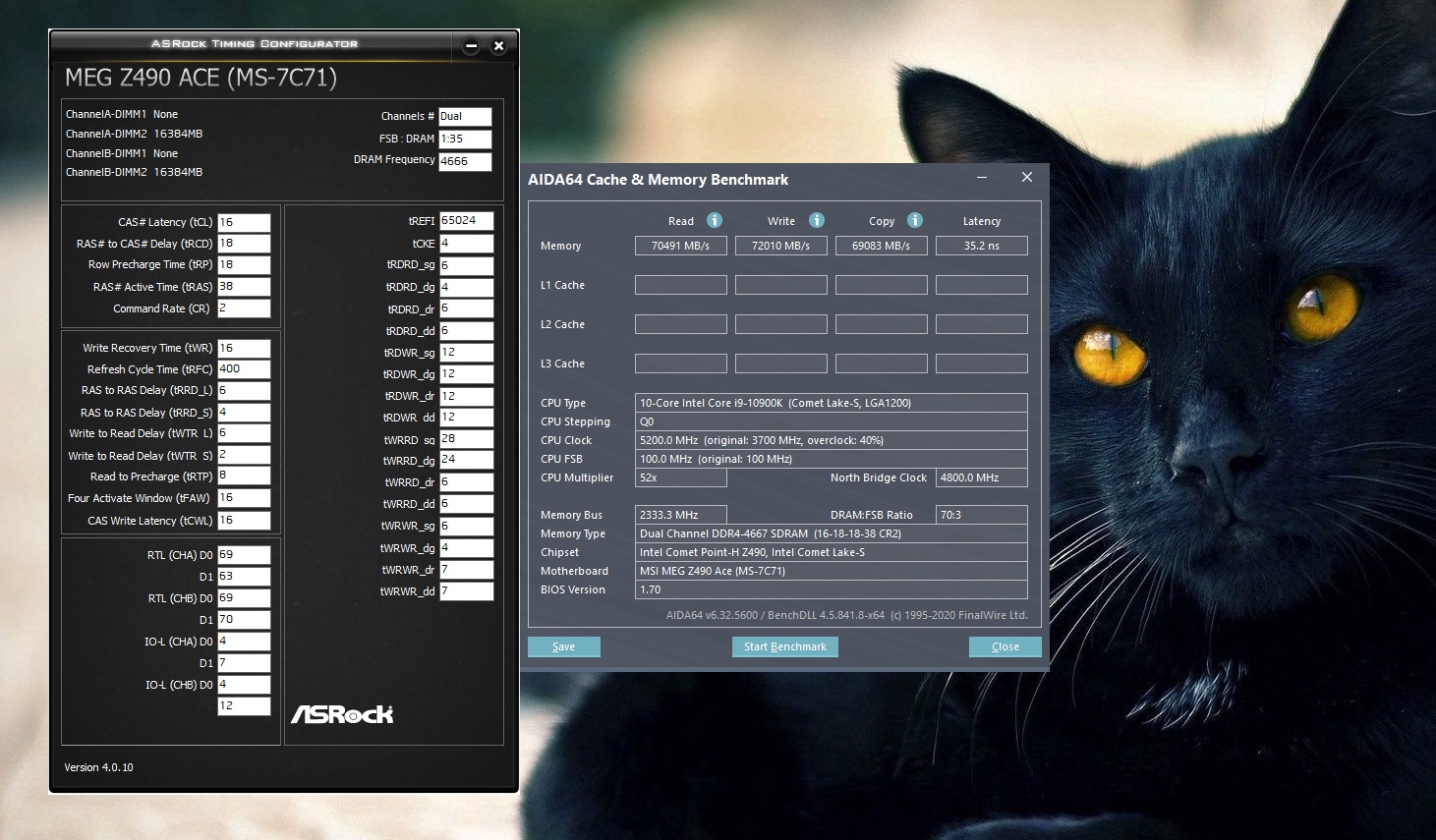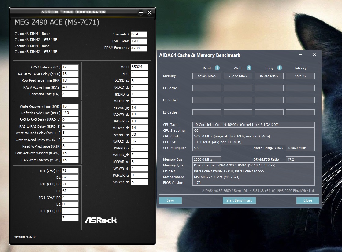 CPU Name: Intel® Core™ i7-9700K @5000MHz 1.33v AVX-2 Motherboard Model: Gigabyte Z390 AORUS MASTER Bios F11m Total Size: 32768 MB (2x16gb) Type: Single Channel (64 bit) DDR4-SDRAM Frequency: 3200 MHz - Ratio 1:38 Timings: 14-14-14-34-2 (tCAS-tRC-tRP-tRAS-tCR) G.Skill Trident Z F4-3200C14Q2-128GTZ