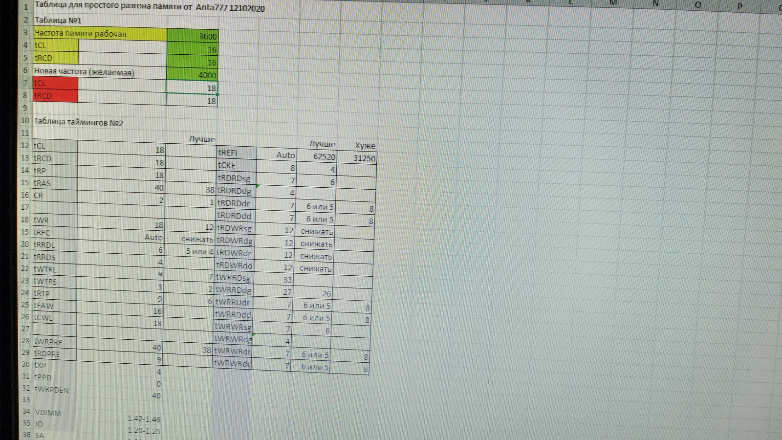 Универсальный гайд. 0. Устраните любые потенциальные проблемы с другим железом. Снимите разгон с видеокарты, снизьте частоту цп на 300 с сохранением напряжения. Не забудьте вернуть RTL в авто если сейчас не авто. 1. Крутим очень короткий мемтест, то есть если минуту живёт сразу снижать тайминг дальше. Ищите не стабильность, а явно сбойное значение тайминга, запишите его - пригодится. Гораздо проще найти явно нерабочее значение и от него плясать чем пытаться ловить нестабильность часами. Это также помогает диагностировать сбойные тайминги на ранее "стабильной памяти". Не пытайтесь найти предельные значение сразу. Сначала скрутите до +2 от минимально стабильного. Многие тайминги идут параллельно поэтому бессмысленно пытаться скрутить до упора с первого прохода. CR выставить на 2 если стоит 1. В самом конце можно попробовать скинуть до 1. 3 Ставить только на очень большую частоту или если по другому ну совсем никак.