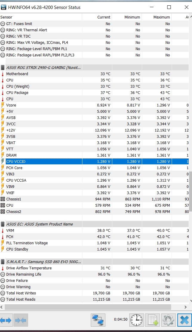Пробовал поднимать напряжения. И выяснилось, что тренировка идет гораздо лучше, если уменьшить VCCIO=1.216 Auto до 1.2В. После этого начинает нормально тренироваться на 3600. Мне кажется даже лучше, чем на 3500. Появилась версия, что ошибки после часа работы TM5 связаны с нагревом. Четыре модуля стоят вплотную совершенно без зазора между ними. Т.е. буквально соприкасаются радиаторами. Сомневаюсь, что можно как-то улучшить охлаждение. Сверху стоит башня NH-D15. Уменьшил REFI до 8316 и чуть увеличил некоторые другие тайминги. Первая ошибка TM5 появилась через 3:39.