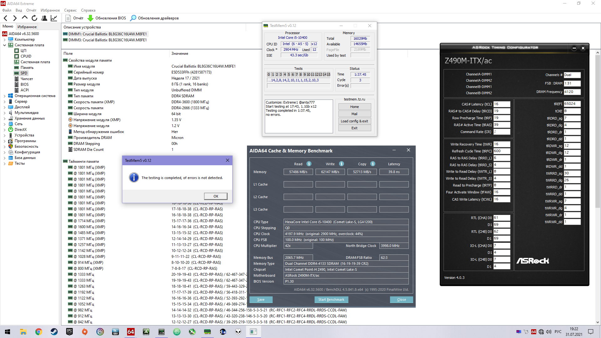 Добавлено спустя 11 минут 52 секунды: yasya311 у меня память 4266 cl18, если не ошибаюсь. Какая у вас скорость чтения и записи в аида64? Сколько гигафлопсов в линксе при задаче 40000 ? Частота процессора какая? Если есть сомнения, то нужно погонять тестовые программы и бенчмарк. На предмет ошибок и сравнительной производительности. Прайм95, Линкс, осct и т.п.
