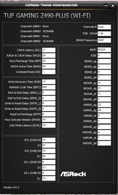 DRAM CAS# Latency [16] DRAM RAS# to CAS# Delay [22] DRAM RAS# ACT Time [40] DRAM Command Rate [N:1] N to 1 ratio [1] DRAM RAS# to RAS# Delay L [6] DRAM RAS# to RAS# Delay S [4] DRAM REF Cycle Time [Auto] DRAM REF Cycle Time 2 [Auto] DRAM REF Cycle Time 4 [Auto] DRAM Refresh Interval [Auto] DRAM WRITE Recovery Time [16] DRAM READ to PRE Time [8] DRAM FOUR ACT WIN Time [16] DRAM WRITE to READ Delay [Auto] DRAM WRITE to READ Delay L [8] DRAM WRITE to READ Delay S [4] DRAM CKE Minimum Pulse Width [8] DRAM Write Latency [16]