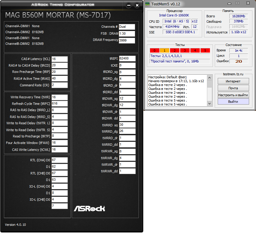 Тоже балики 2хBL8G32C16U4 не едут на 4000 16-20-20-40 - если только все на авто (сильно не проверял, т.к. смысл). С ужатыми сразу ошибки драм\са\ио 1.49\1.30\1.30. Вот 16-21-21-39 наверно возможно. РТЛ-ИОЛ скачут туда-сюда (на авто), вручную ставишь по правилам - мемори фэйл.