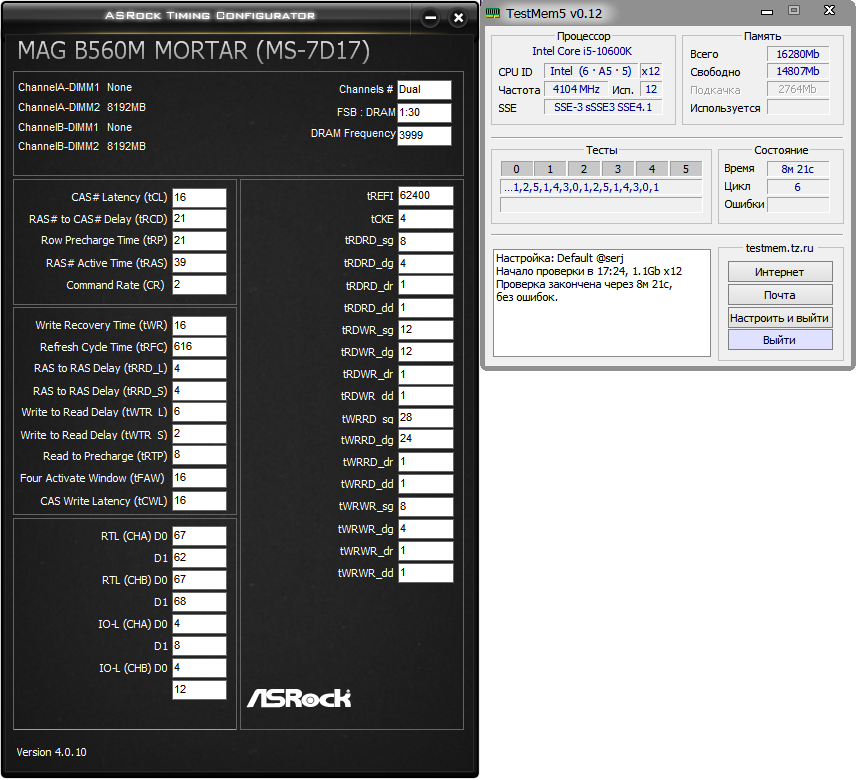 А 16-21-21-39 не пойдет (скрин выше)? Сейчас уже прошло TM5 6 Default и 6 Universal2. А СL17 - 17-22-22-41 уже вроде на 4200 идёт. Мать кстати на частотах выше 4000 ставит авто-СА/ИО 1.4\1.3, не перебор ли.