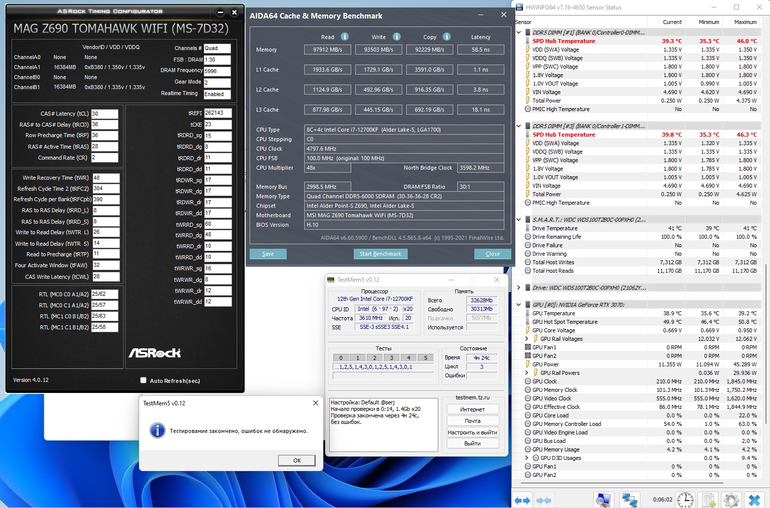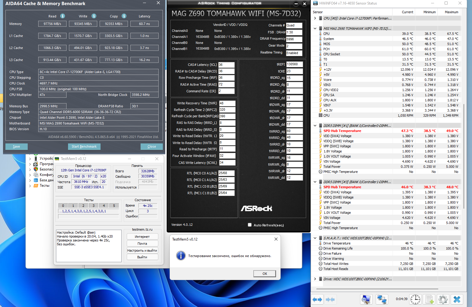 Удалось взять память Patriot Signature PSD516G480081 DDR5 (2 планки по 16 ГБ на чипах Hynix) - выкладываю результаты своего разгона (6000cl36). Может и выше (6200), но уже нестабильность, 6400 вообще не стартует даже при конских напряжениях и таймингах.