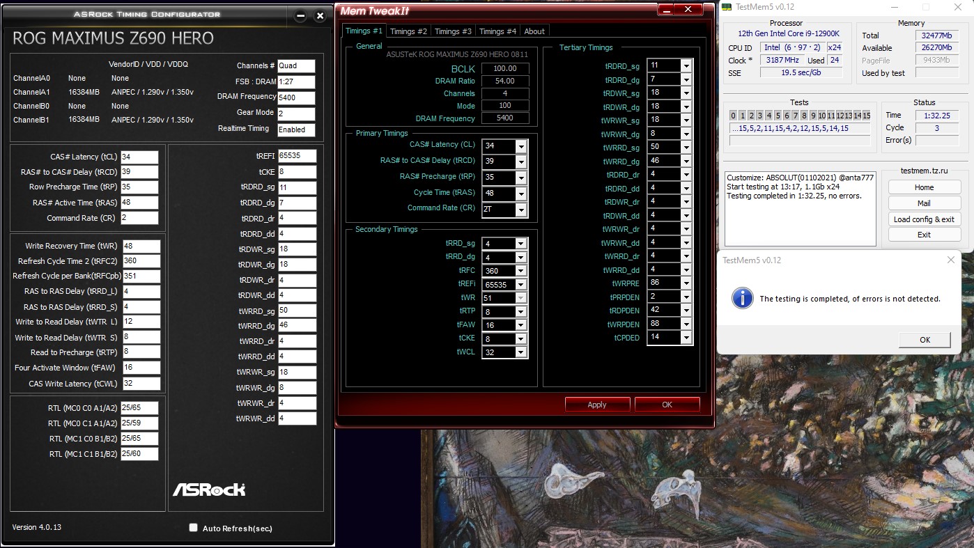 Да, ты прав. Хотя в любом случае, стабильность - дело временное. Может поплыть и со временем, а может в тестах (во всех трех) быть норм на 1-1.5 часа, а в играх (ведьмак, ПУБГ) давать ошибку. Тут либо надо на сутки ставить либо в использовании еще смотреть неделю. Эти тесты на час - исключительно для быстрой проверки, дальше шлифуем. Бывает, что даже заводской профиль xmp через 5-10 лет плывет (у меня несколько случаев с ddr3 с высокими xmp)