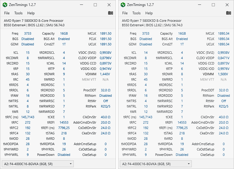 Господа, мне тут пришлось сменить свою сборку (подпись не актуально), сейчас имею следующее: мать MSI B550 Gaming pro, 5800Х (PBO +200/-30@all -20@7/8), память осталась предыдущая (кит G.Skill 3200C14), на 8700к она у меня работала 4233С16. Собственно в чем суть, пытался завести эту память на 3800 здесь, но не получилось (я так понимаю что дело в 1900 IF, потому что материнка даже стартовать отказывалась независимо от выставленных параметров напряжения и таймингов), но на 4000 (и 2000 IF) тестирование Extreme в TM5 (все 3 цикла) проходит на 20х таймингах (поставил от балды с запасов, проверить как поведет себя IF на такой частоте). Это вообще нормальное поведение у райзенов? 1900 какая-то магическая частота? Есть ли смысл пробовать выше 4000 (сильно заморачиваться не хочется, думаю 4000С16 или 4000С17 сделать с подкрученными вторичками/третичками и забить)?
