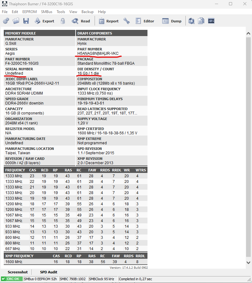Доброго времени суток господа (и возможно дамы) Ситуация следующая. На свою голову купил себе Плашки G.Skill Aegis. (Разумеется по совету друзей) Решил разогнать, скачал тайфун чтоб понять какие чипы на плашках. А там пусто. Тайфун не видит ни типа чипов, ни серийников. Все что известно (как я понял) это номер партии Но судя по данным с оф. сайта Hynix, такой партии не существует. На англоязычных сайтах проскальзывает инфа о том что чипы C-DIE[CJR], но так же делают пометки о том что не уверены в данной инфе. Так что пишу сюда, в надежде, что подскажете.