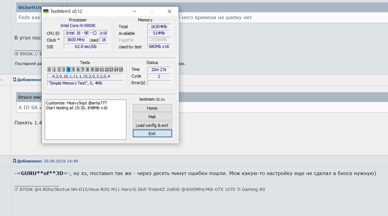 fly1ngh1gh У меня в какой-то момент POE стала вылетать(в том числе в синьку) на скрученных таймингах i5-3470. Линпак, АИДУ, Мемтест, ТМ5 проходит без проблем, компиляция небольших проектов, кодирование, другие игры короче всё что мне пришло в голову работает корректно. Естественно вылетало оно в режиме убей максимально много мобов с максимальной скоростью, а не в типичном повторяемом варианте где ничего не происходит. Поймал проблему когда в очередной раз вылетела, сразу запустил ТМ5 и сразу посыпали ошибки. Видимо какая-то очень специфическая нагрузка создаётся, которую не создают тесты. Например, может очень долго гонять одни и те же ячейки памяти...