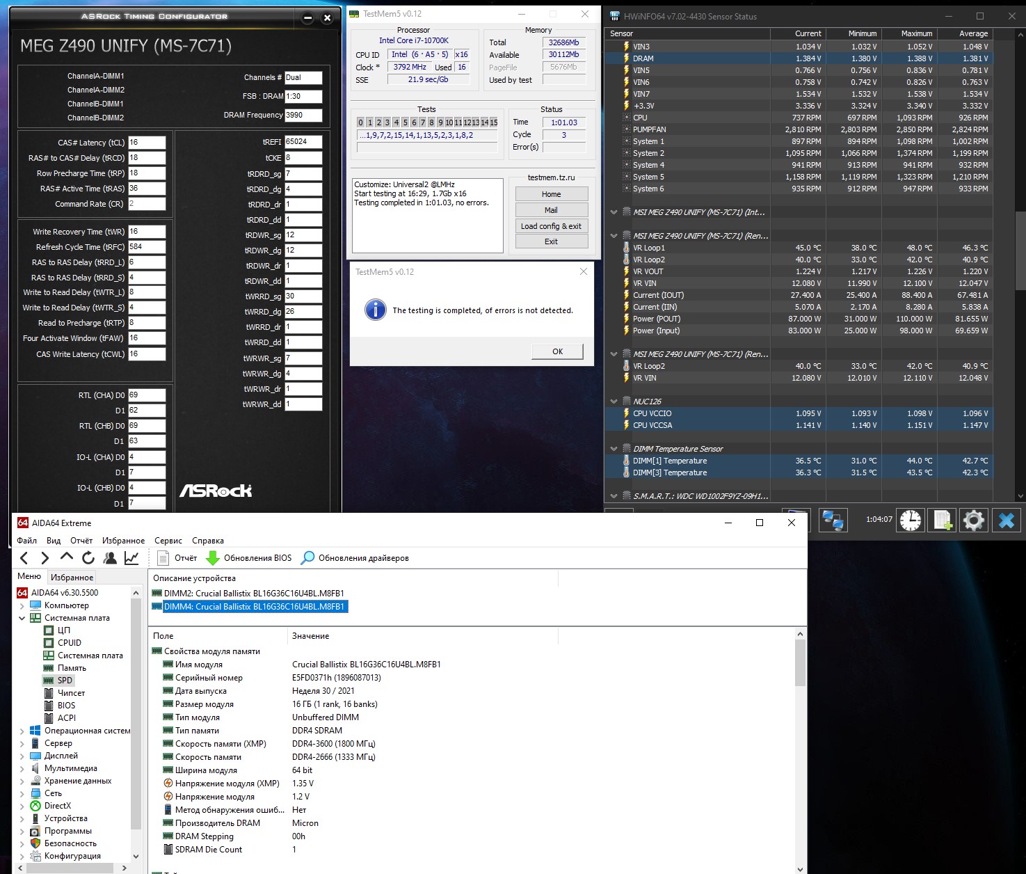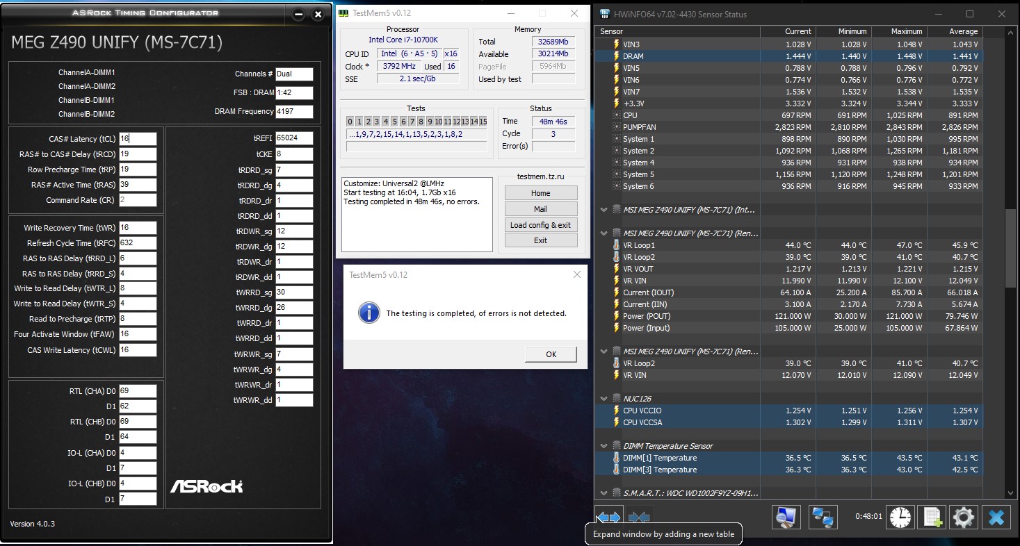 Я не буду ставить напряжения vccio2 и vccsa выше 1,32 В. А при этих напряжениях банально не хочет работать контроллер памяти на частотах 3600 и 3777. Уже просто сделал на память настройки штатного хмр, на котором память отлично работала на 10400Ф. 3600 19-20-20-40 cr2 — хуже не найдешь. Ошибки начали сыпаться сразу же. То есть либо у меня память деградировала к чертям собачьим, либо КП 11gen — полное д*со. Уже 10 раз пожалел, что проапгрейдился. Надо было брать 10850К или ждать 12700К.