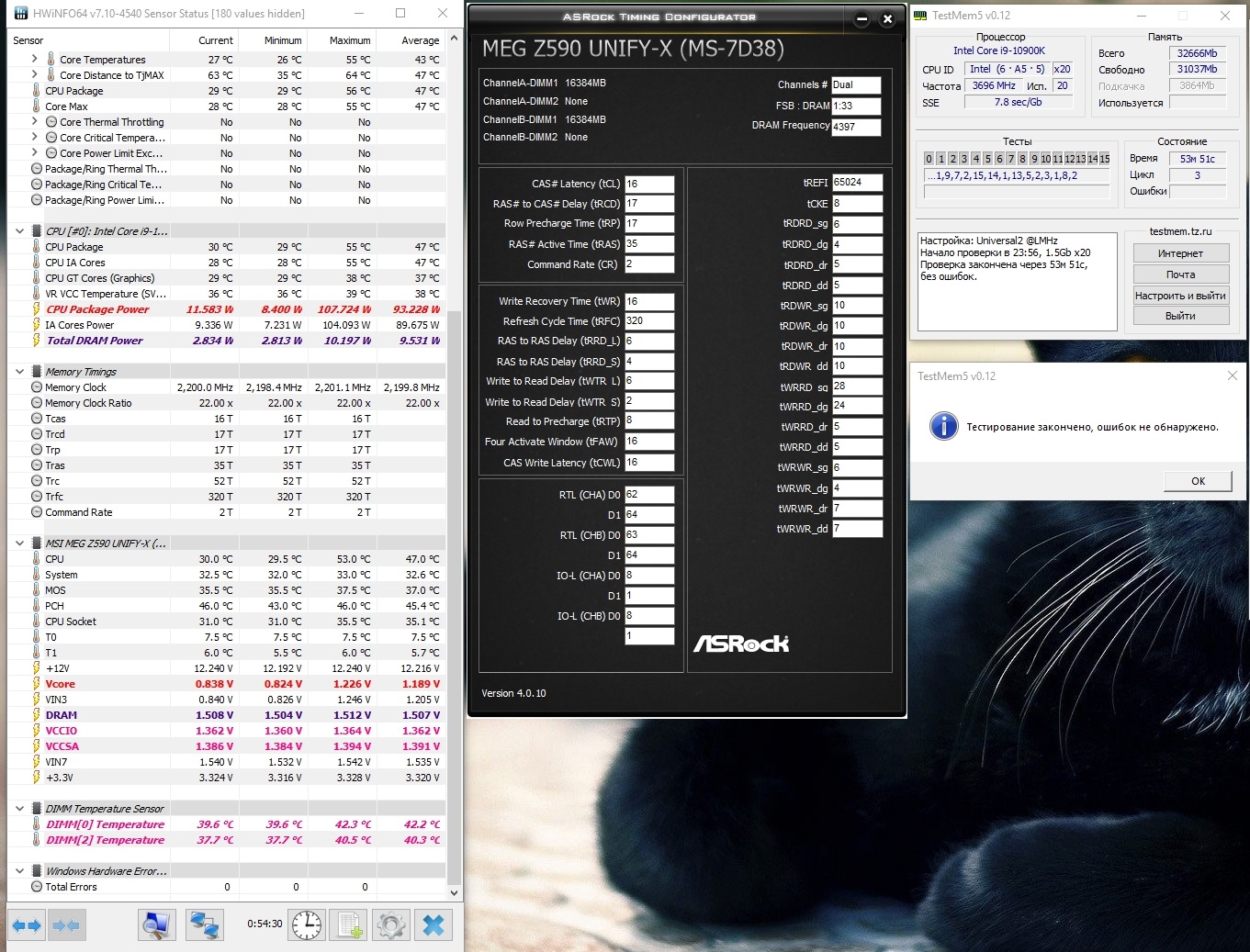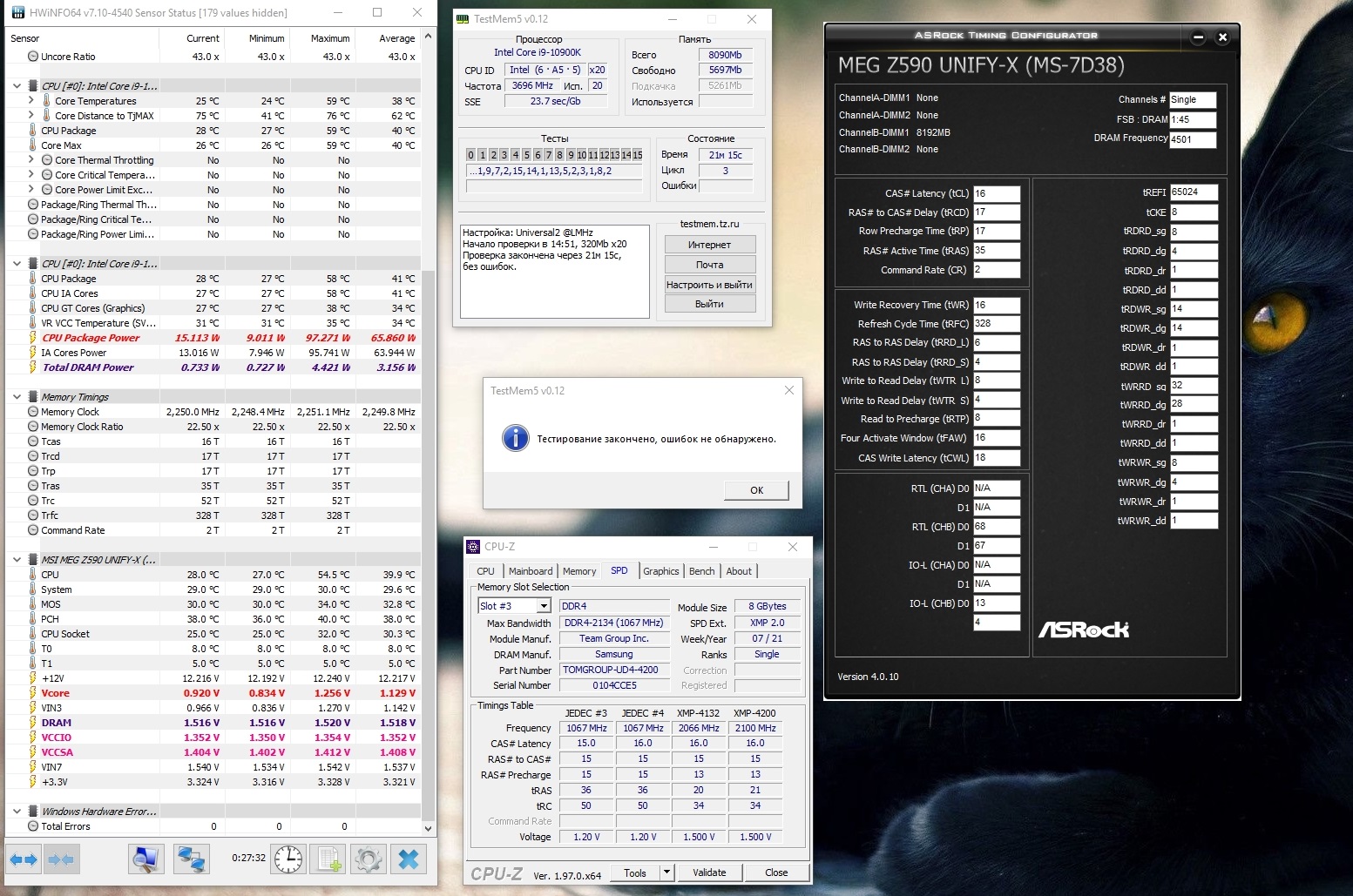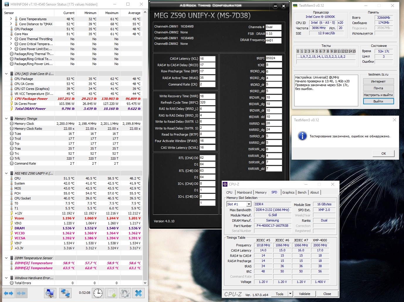 У меня не взлетели Самсунг двуранги F4-3200C14D-32GTZSK... Ни о каких 4КГц речи даже нет. Максимум иногда загрузить удавалось Винду на 3800 17-17-38cr2... Стабильно работает только 3600 17-18-38cr1 или cr2 и то тестить надо... Наверное, надо сдавать это чудо обратно и брать балистиксы, там хоть заявленные 3600 и главное дешевле... Я в шоке...