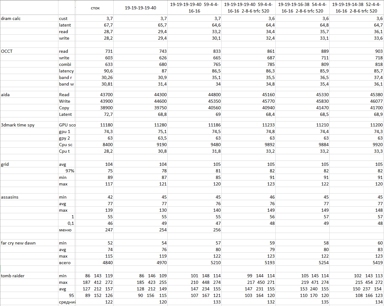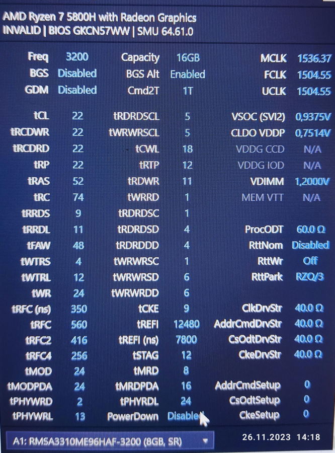 Доброго времени суток, есть ноут Legion 5 на Ryzen 7 5800H, память попалась тормознутая(есть плашки с более низкими вторичками), поэтому решил помучать свою). В ноуте нет возможности изменять тайминги, поэтому при помощи программатора на ардуинке меняю тайминги в самой SPD. Пока настроил так, tCL и tRCD опускаться ниже категорически отказываются. Где-то вычитал что на АМД tRP можно делать ниже tRCD, пока остановился на 14(ниже не пробовал). Тайминги, которые могу прописывать указаны ниже. Единственное tFAW почему-то в SPD зашиваю 16, а он везде отображается 28. tCl 19 tRCD 19 tRP 14 tRAS 38 tRC 54 tRFC 520 tRRDS 4 tRRDL 4 tFAW 16(28) tWR 16 tWTRS 2 tWTRL 8 tCCDL 6 Прошу энтузиастов посмотреть, возможно посоветуете где-то, что-то подправить. И да частота 3200, напряжение 1,2(это тоже выше не поднять)
