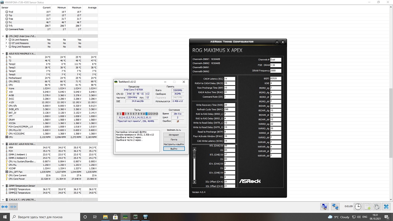 Здравствуйте. Конфиг: IX APEX (порт с X), 8700K, плашки 2х16 дуалы В2 трайденты 4000-19GTZKK. Пытаюсь нащупать конфиг на 4000 14-15-15-31 (к сожалению, 4000 14-14-14-28 пока не хочет). Есть пару вопросов. 1) tWR по формулам выставлен, как RTP умноженное на два, т.е. =16, а в асроке показывает 20. Почему? 2) IO и SA около 1.37V, хотя по биосу 1.325 выставлено, откуда такая погрешность? 3) Тестирую Universal2, в прошлый раз было чуть ниже IO и SA (около 1.35V, если судить по HWinfo), не было охлада и не была зафиксирована тренировка, температуры по памяти были 48-49 градусов в тесте, насыпало кучу ошибок (больше 20, точно) в тестах 1, 2, 5 ещё до окончания первого цикла. Теперь настройки RTL фиксированы, добавил вертушку (температура памяти не превышает 36 гр.), остались единичные ошибки в тесте №2. Куда копать и по каким настройкам памяти бъёт этот тест №2 в universal2? Скрин текущего прилагаю.