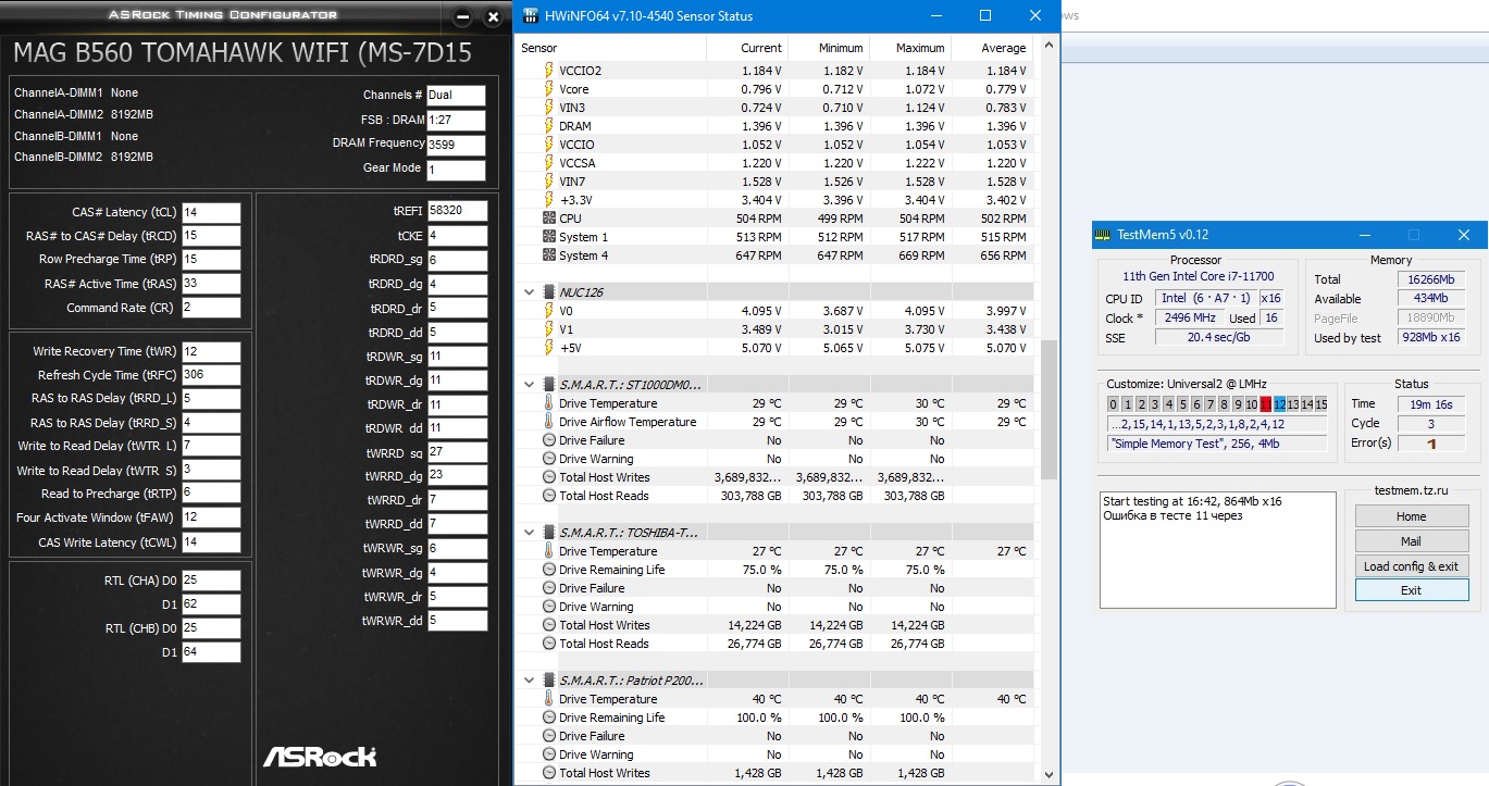 Всем знатокам привет. Отполировал память на 3600 cl16 и сохранил профиль. Теперь решил ужать первичные тайменги пока вот что получилось, все на скринах, но при прохождении теста ошибка в 11 тесте. Подскажите куда копать может какие тайменги увеличить нужно или вольтажи. Так же есть пару вопросов, на постоянку для 11 поколения какие безопасные напруги в частности интересует для SA и IO2 ну и для памяти конечно.