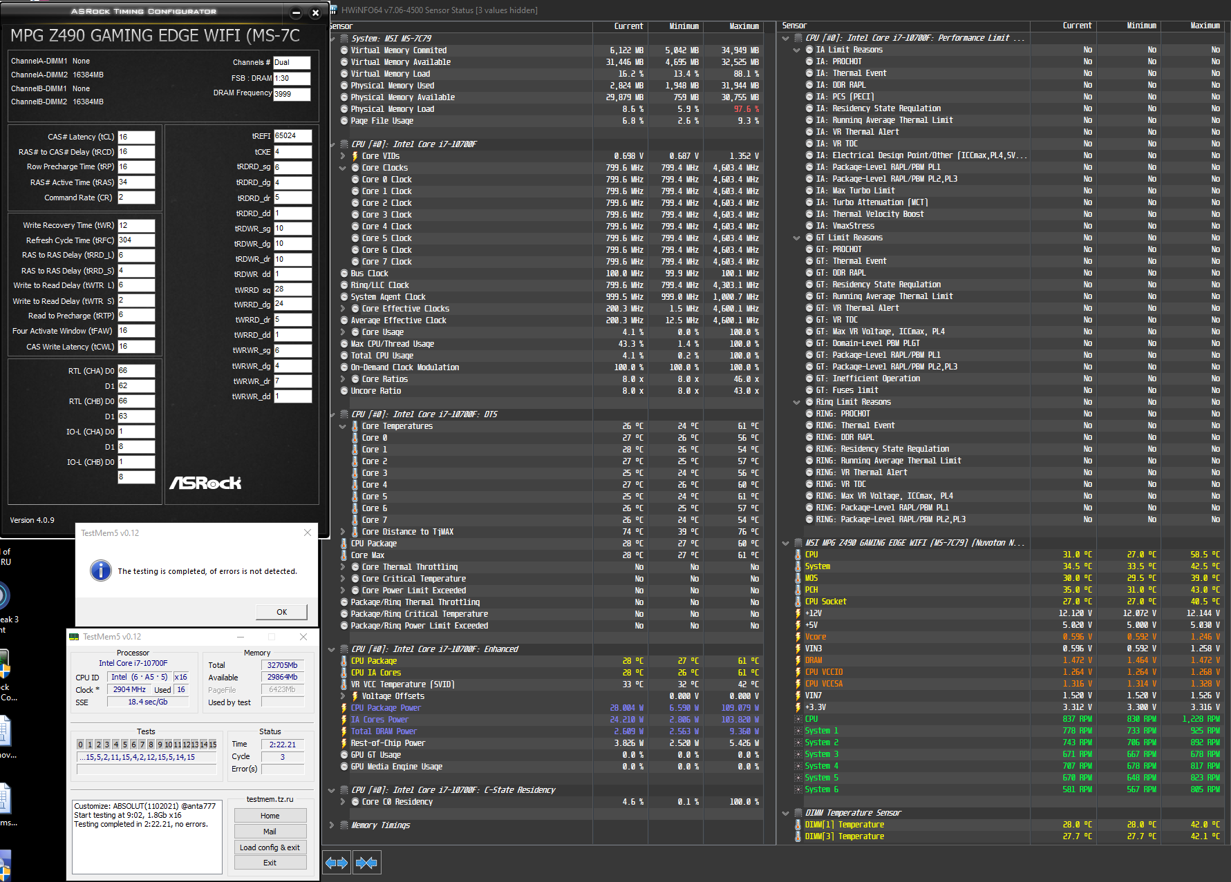 [quote="Gemer"]Всем знатокам привет. Отполировал память на 3600 cl16 и сохранил профиль. Теперь решил ужать первичные тайменги пока вот что получилось, все на скринах, но при прохождении теста ошибка в 11 тесте. Подскажите куда копать может какие тайменги увеличить нужно или вольтажи. Так же есть пару вопросов, на постоянку для 11 поколения какие безопасные напруги в частности интересует для SA и IO2 ну и для памяти конечно.